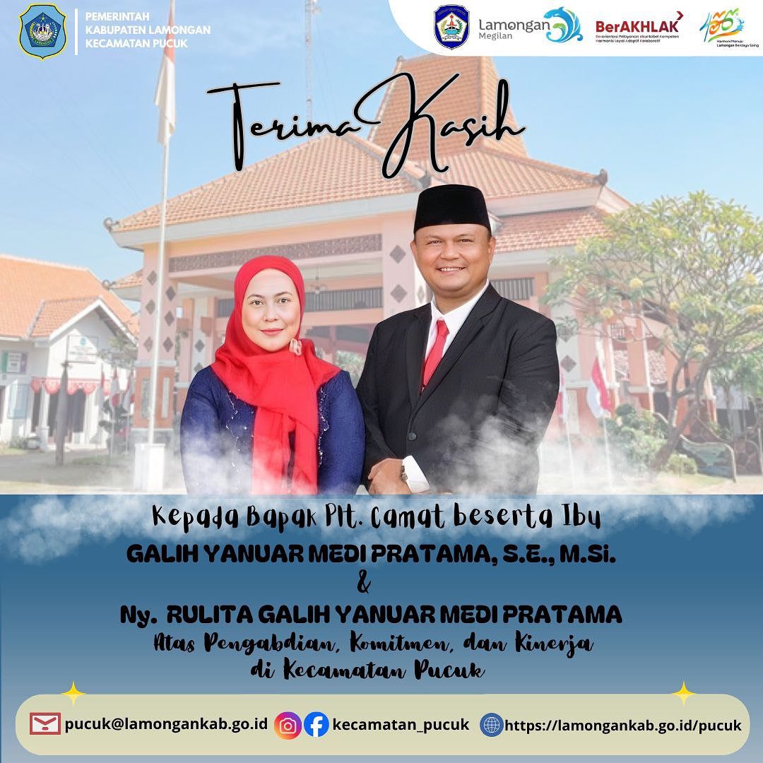 Ucapan terima kasih kami sampaikan kepada Bapak Plt. Camat Pucuk, Galih Yanuar Medi Pratama, S.E., M.Si. beserta Ibu, atas dedikasi, kerja keras, dan pengabdian selama 3 bulan menjabat di Kecamatan Pucuk. Meskipun waktu pengabdian terbilang singkat, Bapak telah memberikan semangat baru, kontribusi positif, serta teladan dalam kepemimpinan yang profesional dan penuh tanggung jawab. Kehadiran Bapak dan Ibu meninggalkan kesan mendalam bagi seluruh jajaran dan masyarakat Kecamatan Pucuk.