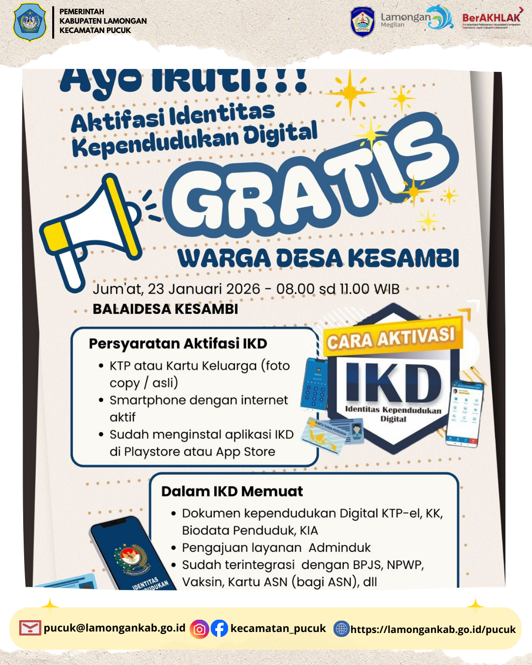 Pemerintah Kecamatan Pucuk terus mendukung transformasi layanan administrasi kependudukan yang lebih mudah, cepat, dan modern. Pada Jumat, 23 Januari 2026, telah dilaksanakan kegiatan Pendaftaran Identitas Kependudukan Digital (IKD) di Desa Kesambi, Kecamatan Pucuk, Kabupaten Lamongan.