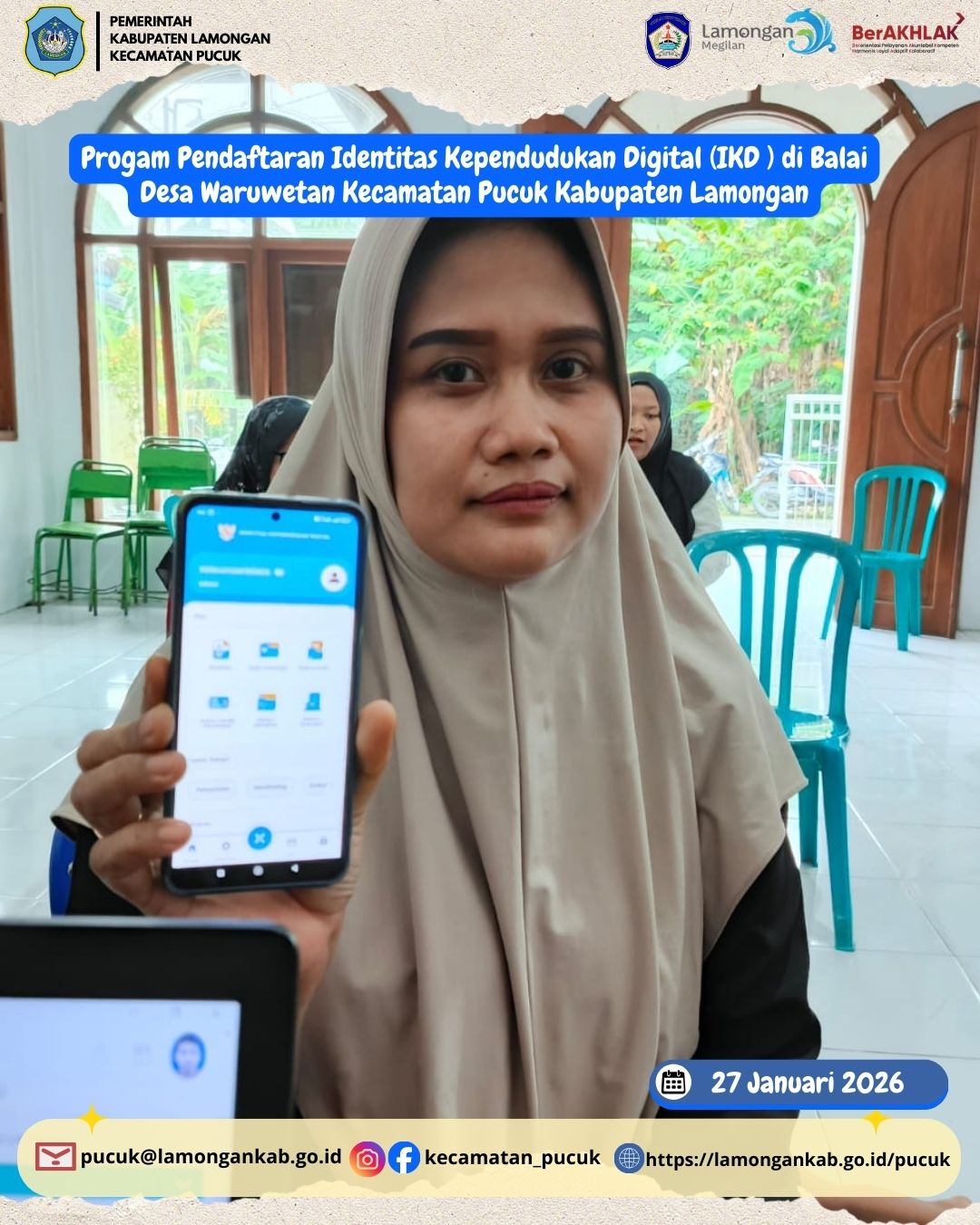 Dalam rangka meningkatkan kualitas pelayanan administrasi kependudukan serta mendukung percepatan transformasi digital, Kecamatan Pucuk bekerja sama dengan Dinas Kependudukan dan Pencatatan Sipil Kabupaten Lamongan melaksanakan Program Jemput Bola Pendaftaran Identitas Kependudukan Digital (IKD) yang bertempat di Balai Desa Waruwetan.