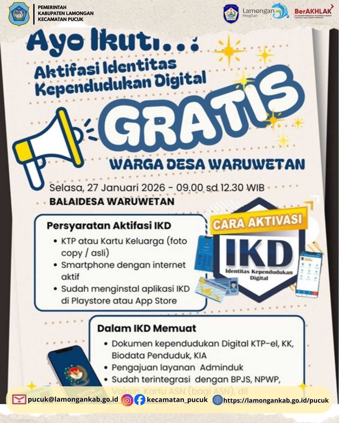 Dalam rangka mendukung percepatan transformasi digital di bidang administrasi kependudukan serta meningkatkan kualitas pelayanan publik kepada masyarakat, Pemerintah Kecamatan Pucuk Kabupaten Lamongan akan melaksanakan kegiatan Pendaftaran Identitas Kependudukan Digital (IKD).