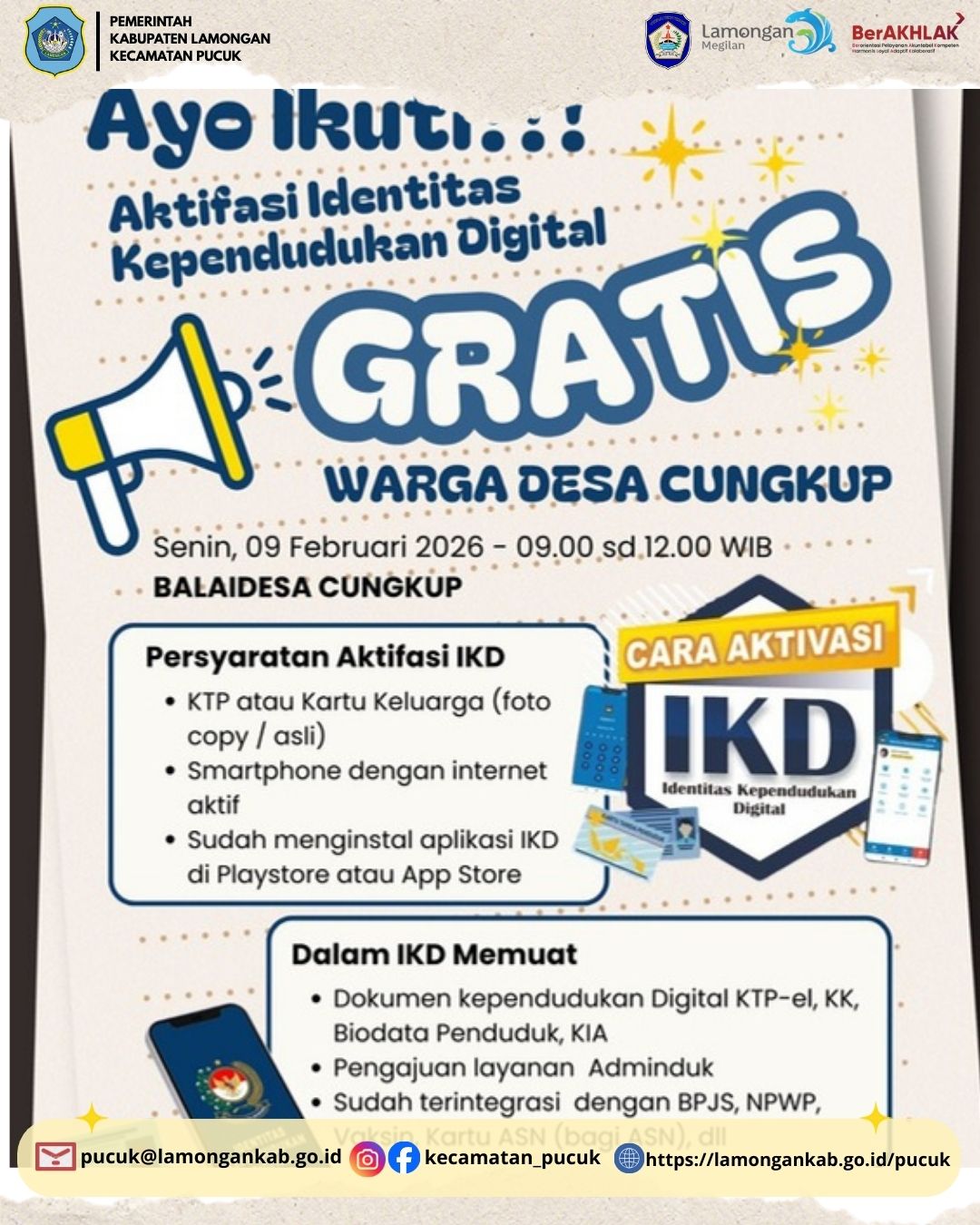 Dalam rangka mendukung transformasi pelayanan publik yang modern, cepat, dan berbasis digital, Kecamatan Pucuk Kabupaten Lamongan akan melaksanakan Kegiatan Pendaftaran Identitas Kependudukan Digital (IKD) bagi masyarakat.