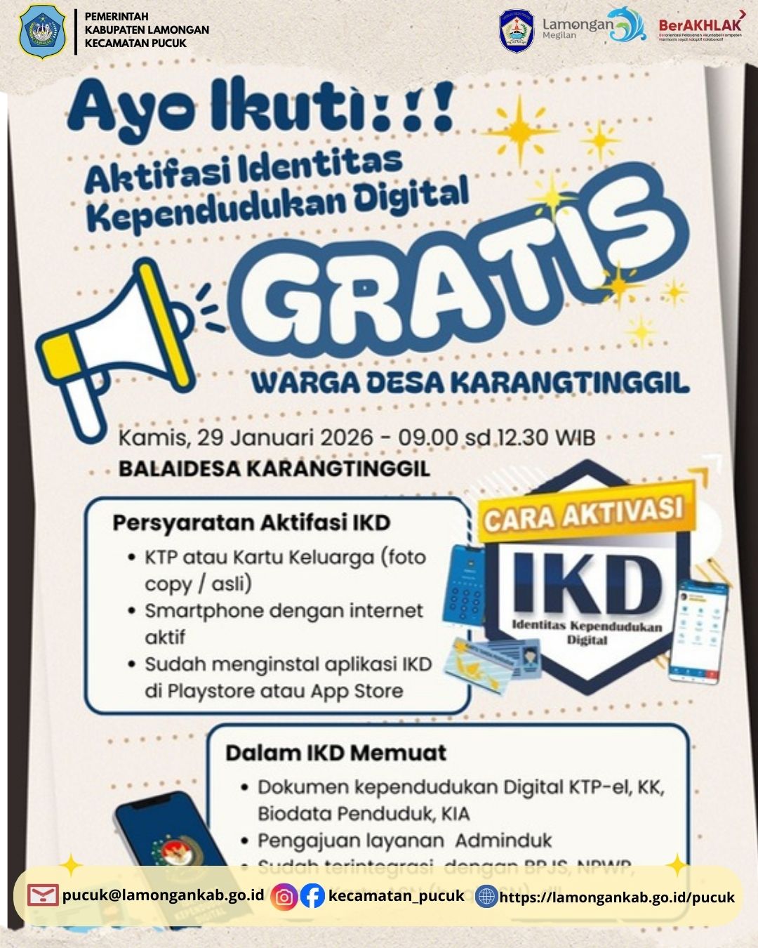 Dalam rangka mendukung percepatan transformasi digital di bidang administrasi kependudukan serta meningkatkan kualitas pelayanan publik kepada masyarakat, Pemerintah Kecamatan Pucuk Kabupaten Lamongan akan menyelenggarakan Kegiatan Pendaftaran Identitas Kependudukan Digital (IKD) yang akan dilaksanakan pada Kamis, 29 Januari 2026, bertempat di Desa Karangtinggil, Kecamatan Pucuk, Kabupaten Lamongan.