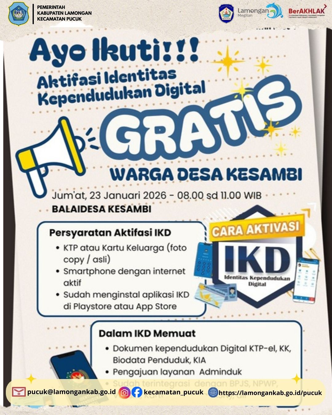 Dalam rangka mendukung transformasi digital pelayanan administrasi kependudukan serta meningkatkan kemudahan akses dokumen kependudukan bagi masyarakat, Pemerintah Kecamatan Pucuk melaksanakan Kegiatan Pendaftaran Identitas Kependudukan Digital (IKD).