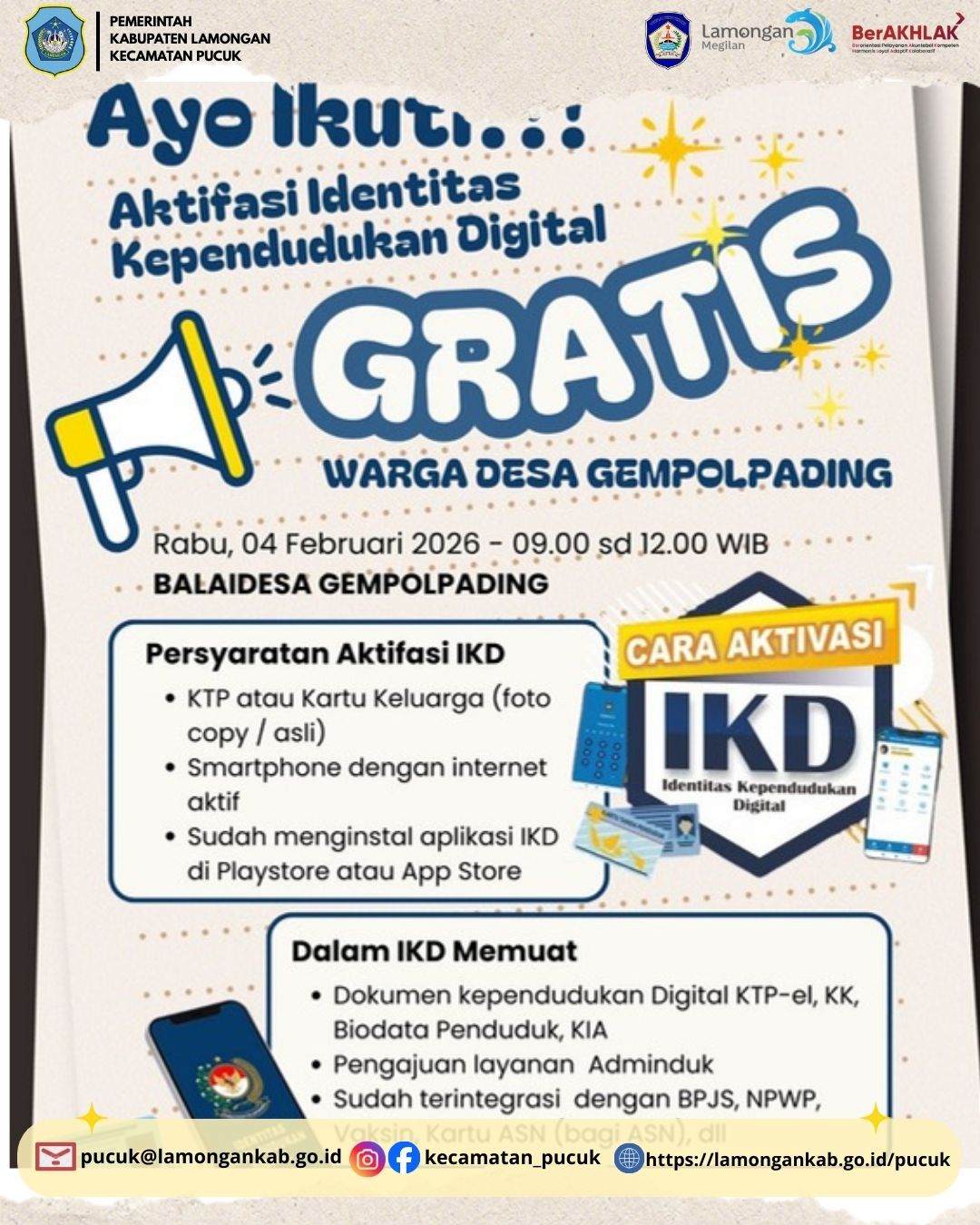 Kegiatan pendaftaran IKD ini akan diselenggarakan pada Rabu, 4 Februari 2026, bertempat di Desa Gempolpading, Kecamatan Pucuk, Kabupaten Lamongan. Program ini merupakan bagian dari upaya pemerintah dalam mewujudkan pelayanan publik yang modern, efisien, dan berorientasi pada kemudahan masyarakat, di mana dokumen kependudukan dapat diakses secara digital melalui perangkat gawai masing-masing warga.