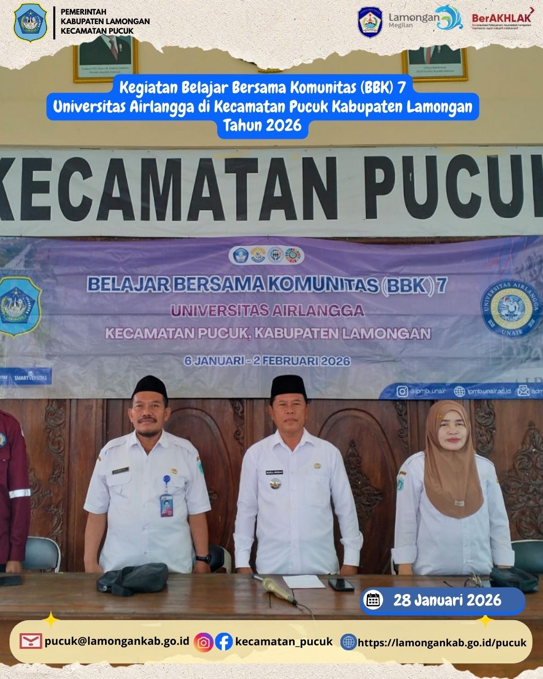 Pucuk, 28 Januari 2026 – Kecamatan Pucuk Kabupaten Lamongan menerima dan mendampingi pelaksanaan Kegiatan Belajar Bersama Komunitas (BBK) 7 Universitas Airlangga sebagai wujud nyata pengabdian mahasiswa kepada masyarakat. Kegiatan ini merupakan bagian dari implementasi Tri Dharma Perguruan Tinggi, khususnya pada bidang pengabdian kepada masyarakat, yang bertujuan untuk memberikan kontribusi langsung dalam pengembangan potensi desa serta peningkatan kualitas sumber daya manusia di wilayah Kecamatan Pucuk.
