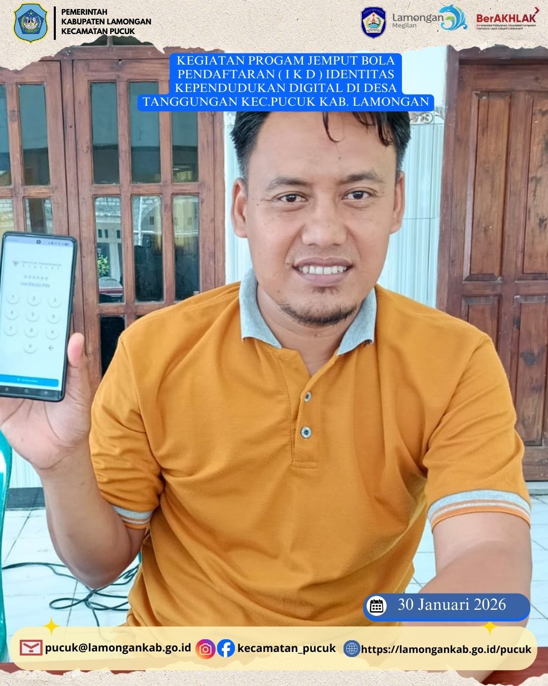 Pada tanggal 30 Januari 2026, Pemerintah Kecamatan Pucuk bersama Dinas Kependudukan dan Pencatatan Sipil Kabupaten Lamongan menggelar kegiatan Program Jemput Bola Pendaftaran Identitas Kependudukan Digital (IKD) yang bertempat di Desa Tanggungan, Kecamatan Pucuk. Kegiatan ini merupakan langkah konkret dalam memberikan kemudahan akses layanan administrasi kependudukan kepada masyarakat, serta mendukung upaya digitalisasi data kependudukan yang lebih efisien, akurat, dan transparan.