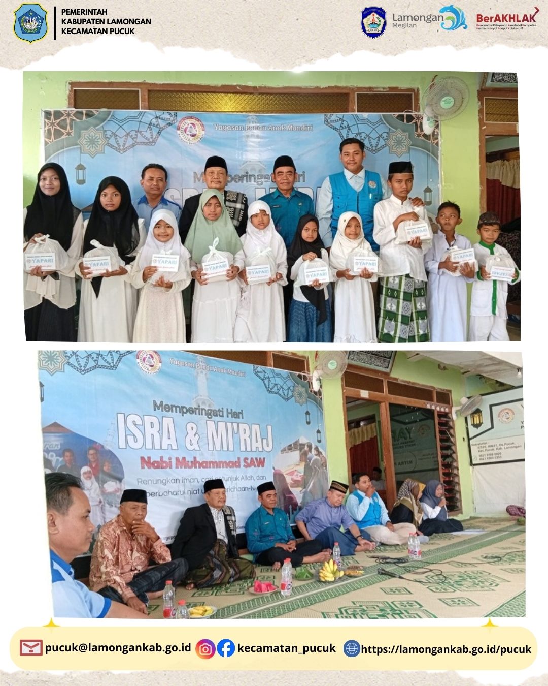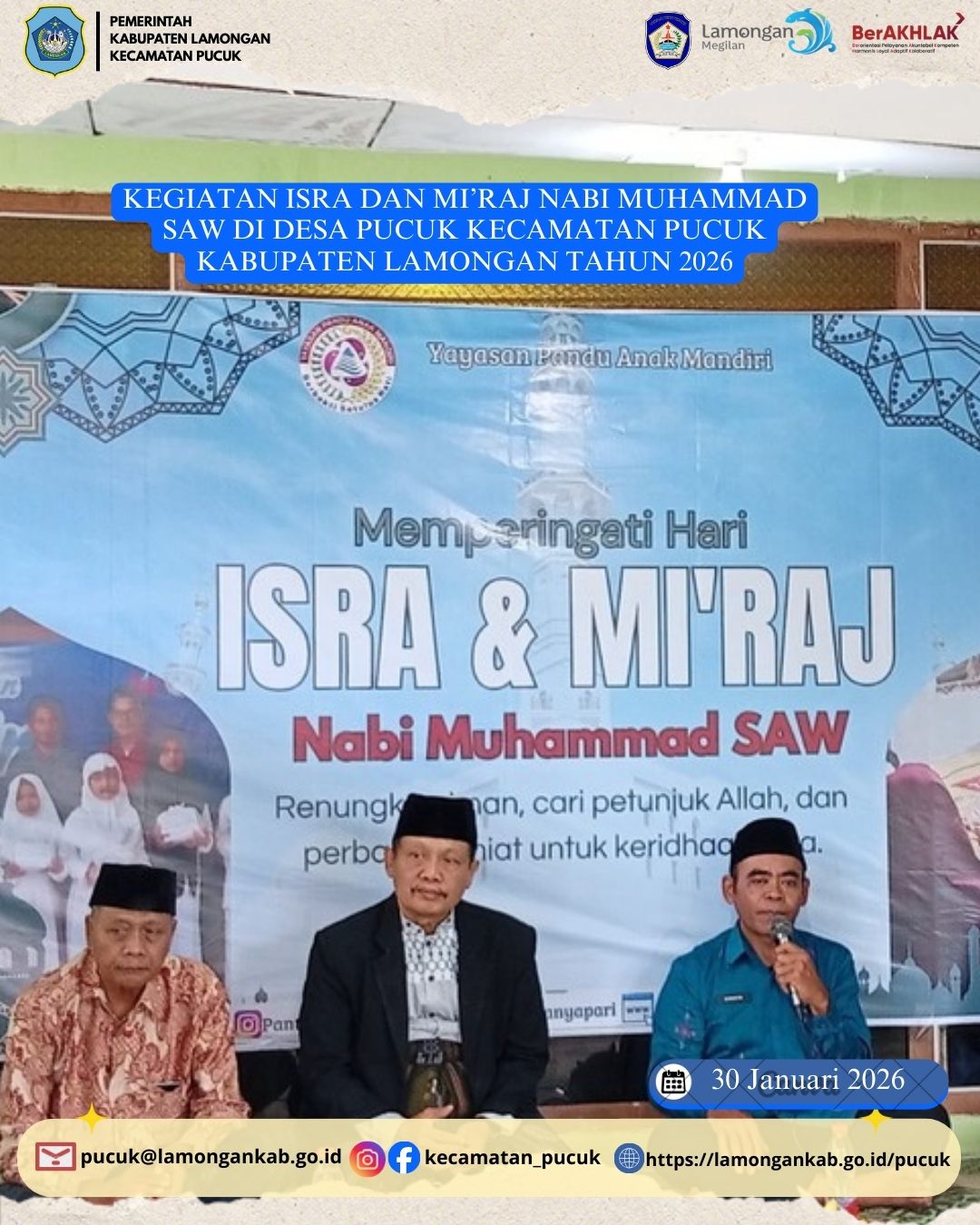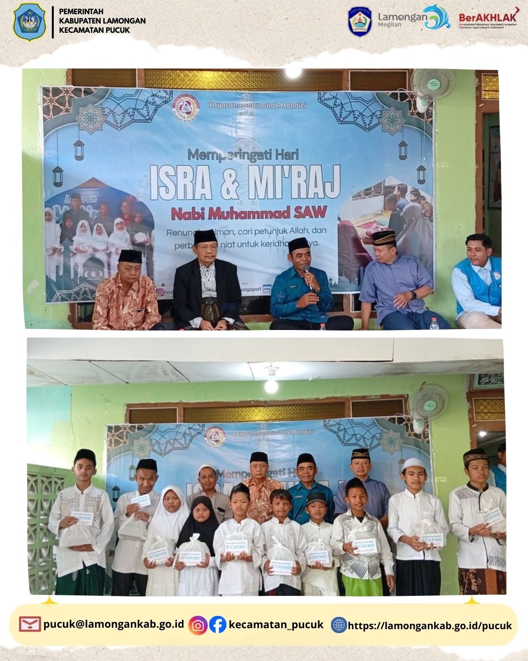 Dalam rangka meningkatkan keimanan dan ketakwaan kepada Allah SWT, Pemerintah Desa Pucuk bersama masyarakat menyelenggarakan Kegiatan Peringatan Isra’ dan Mi’raj Nabi Muhammad di pondok yang terletak di Desa Pucuk yang dilaksanakan pada: