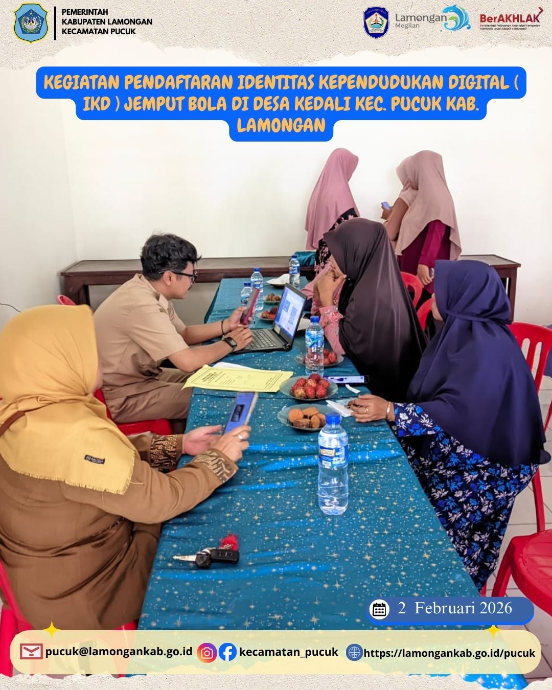 Pemerintah Kecamatan Pucuk terus berkomitmen meningkatkan kualitas pelayanan publik, khususnya di bidang administrasi kependudukan. Pada Senin, 2 Februari 2026, telah dilaksanakan Kegiatan Pendaftaran Identitas Kependudukan Digital (IKD) melalui layanan jemput bola yang bertempat di Desa Kedali, Kecamatan Pucuk, Kabupaten Lamongan.
