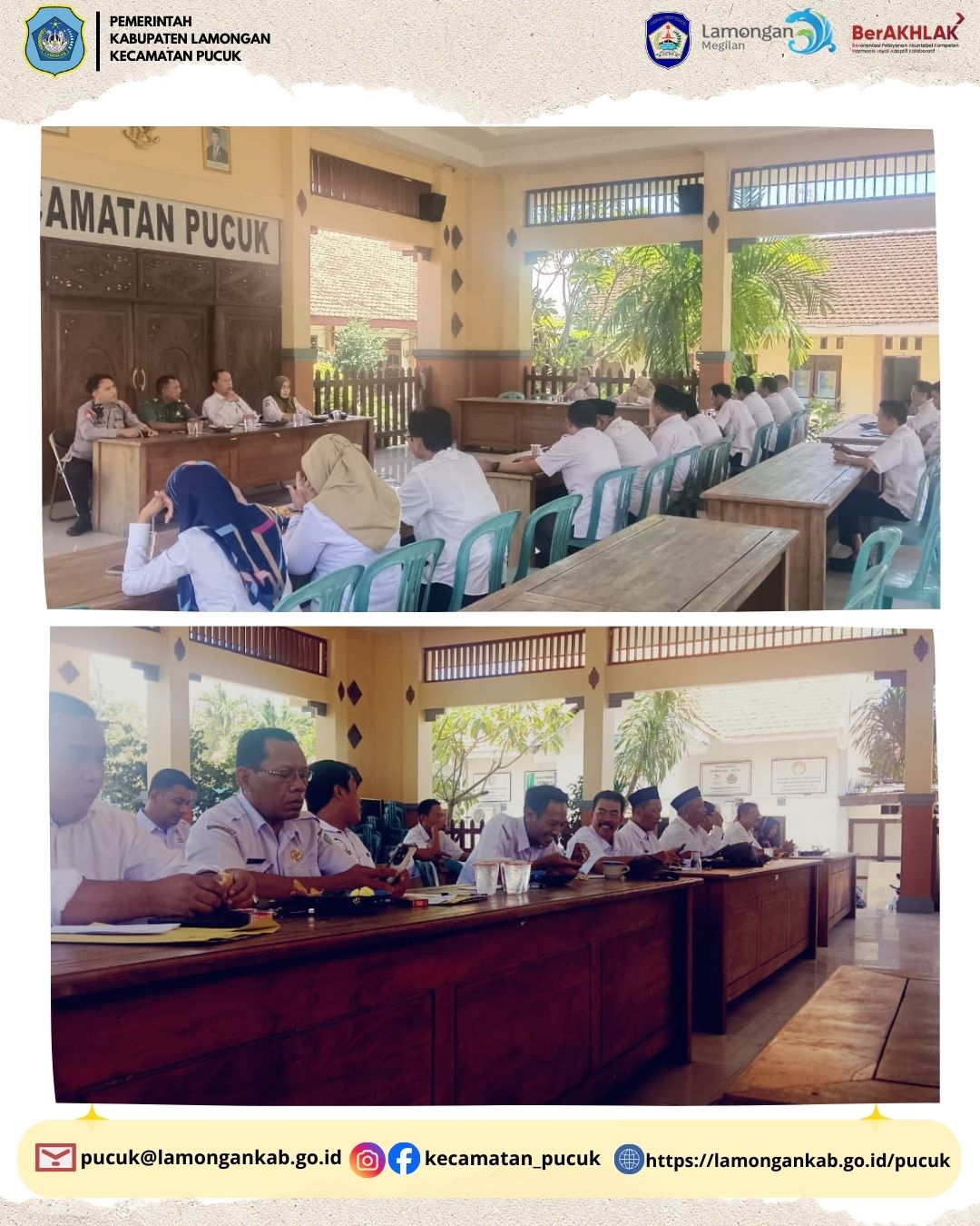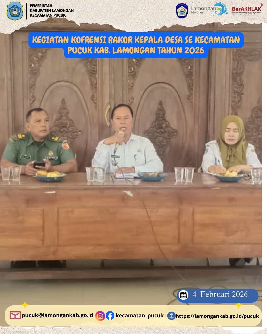 Rabu, 4 Februari 2026, bertempat di Pendopo Kecamatan Pucuk, telah dilaksanakan Konferensi Kepala Desa se-Kecamatan Pucuk, Kabupaten Lamongan. Kegiatan ini di pimpin oleh Bapak Camat Pucuk beserta jajaran Forkopimcam, seluruh Kepala Desa dari 18 desa di wilayah Kecamatan Pucuk, serta perwakilan dari Dinas Pemberdayaan Masyarakat dan Desa (PMD) Kabupaten Lamongan.