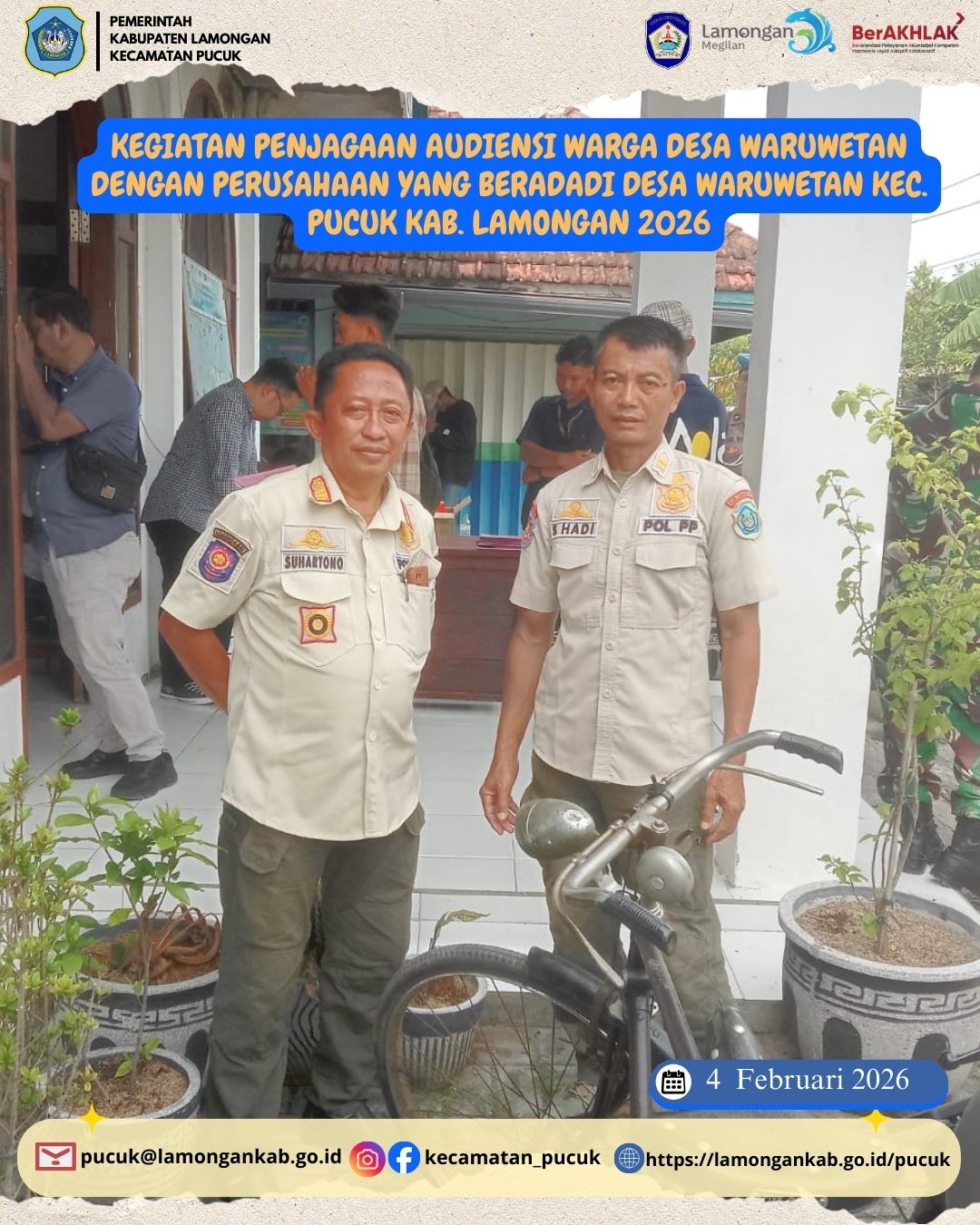 Pemerintah Kecamatan Pucuk melaksanakan kegiatan penjagaan dan pengamanan audiensi antara warga Desa Waruwetan dengan pihak perusahaan yang beroperasi di wilayah Desa Waruwetan, pada Rabu, 4 Februari 2026. Kegiatan ini dilaksanakan sebagai bentuk fasilitasi, pengawasan, serta upaya menjaga kondusivitas wilayah agar proses audiensi berjalan dengan aman, tertib, dan lancar.