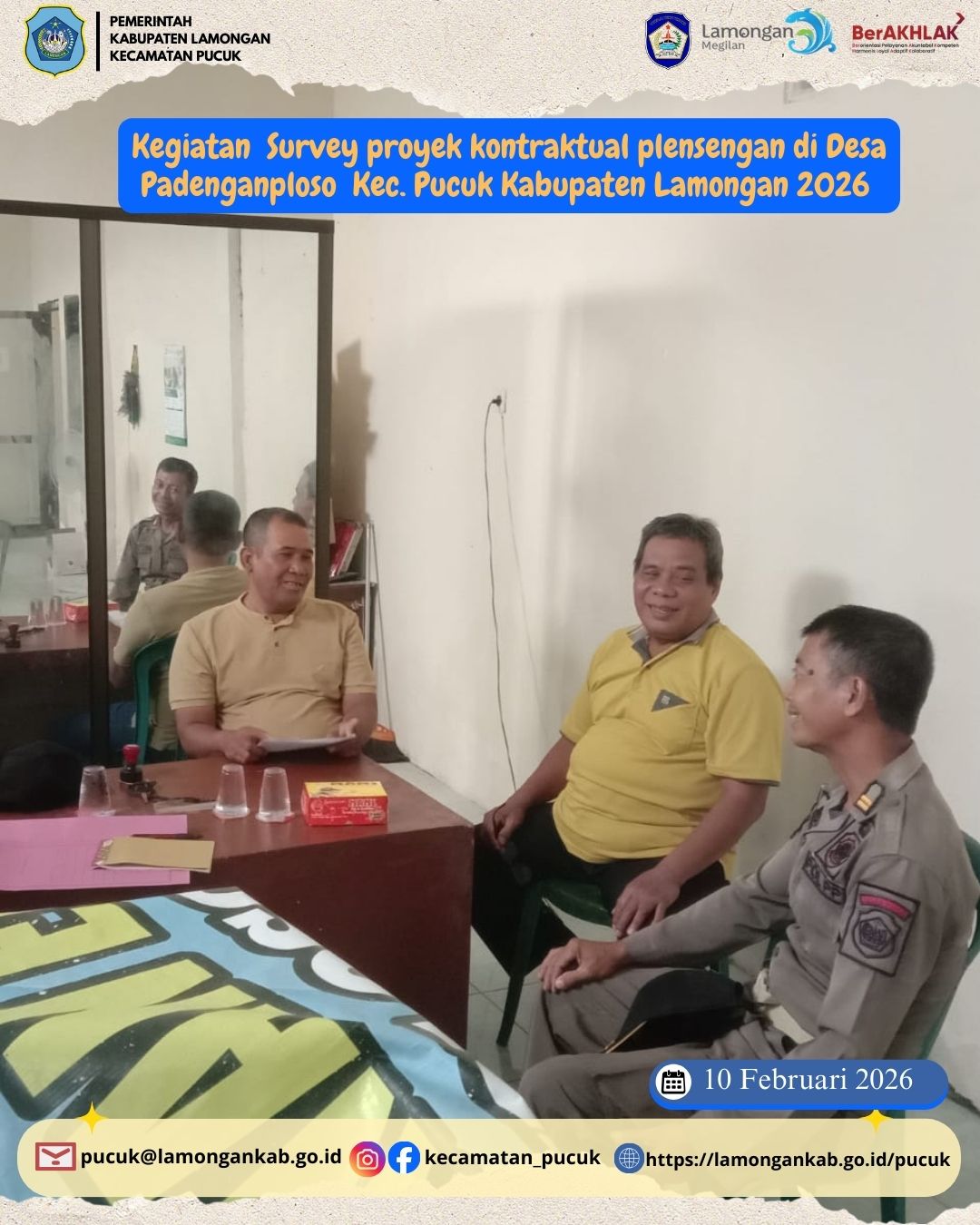 Selasa, 10 Februari 2026, telah dilaksanakan kegiatan survei lapangan untuk Proyek Kontraktual Plengsengan di Desa Padenganploso, Kecamatan Pucuk. Kegiatan ini merupakan tahapan awal yang sangat penting dalam rangka memastikan kesiapan pelaksanaan pembangunan plengsengan sebagai upaya peningkatan infrastruktur desa dan penguatan struktur penahan tanah di wilayah yang berpotensi mengalami longsor maupun erosi.