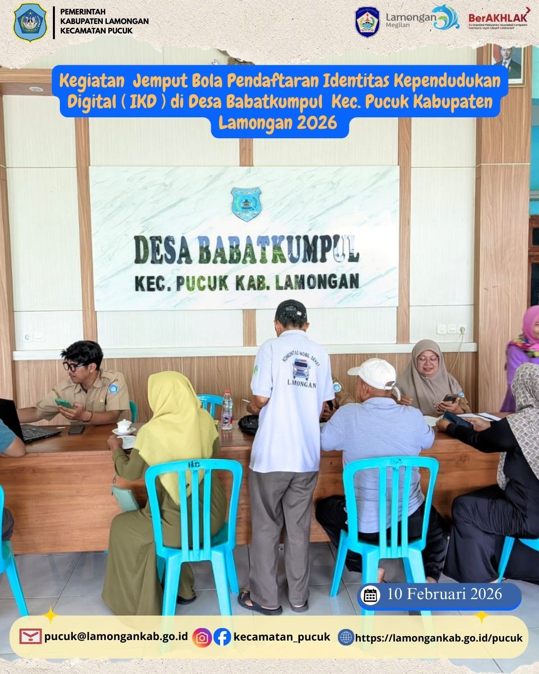 Pemerintah Kecamatan Pucuk kembali melaksanakan kegiatan Jemput Bola Pendaftaran Identitas Kependudukan Digital (IKD) yang bertempat di Desa Babatkumpul, Kecamatan Pucuk, Kabupaten Lamongan.