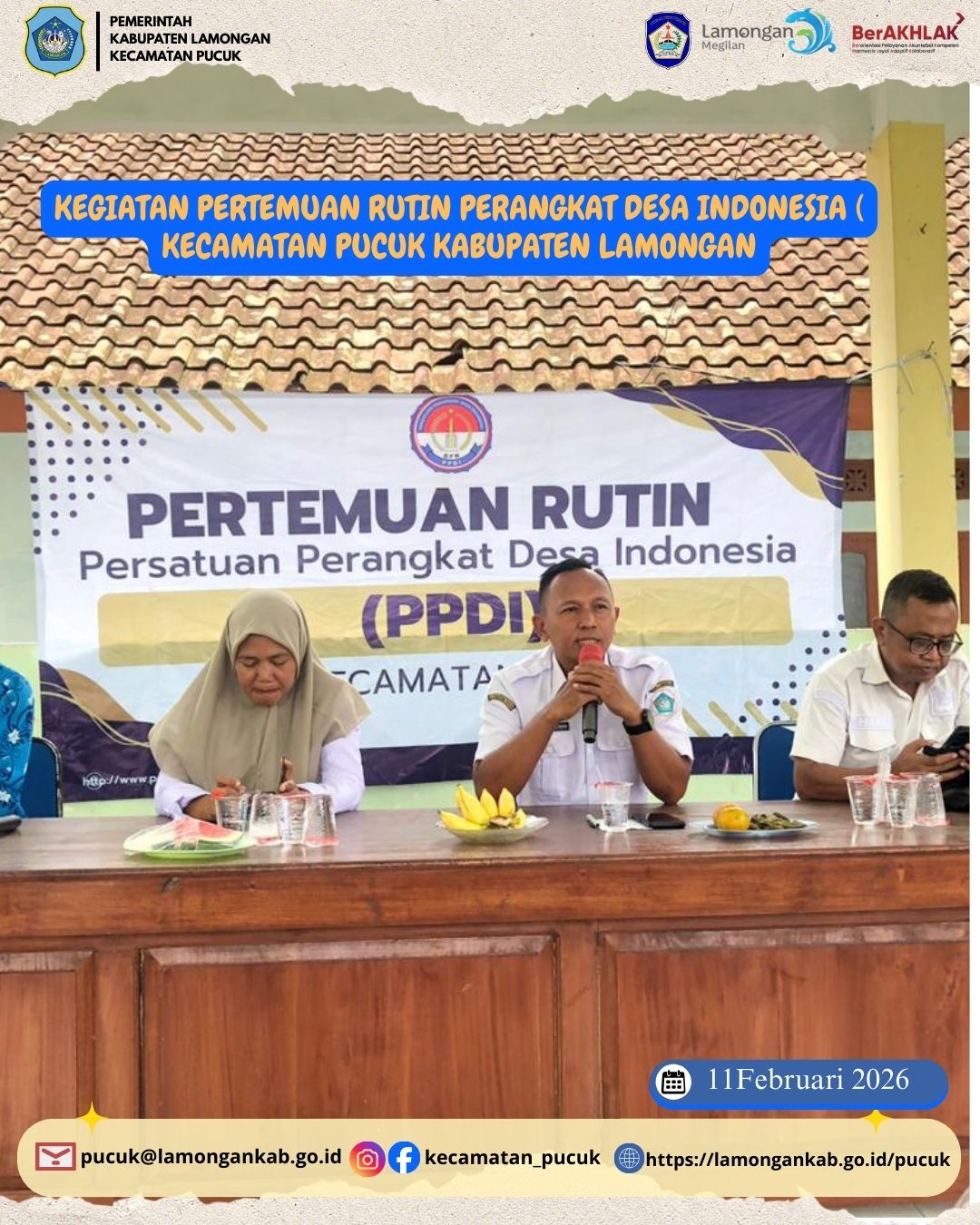 Pada tanggal 11 Februari 2026, Kecamatan Pucuk, Kabupaten Lamongan, kembali menyelenggarakan kegiatan pertemuan rutin perangkat desa se-Kecamatan Pucuk. Kegiatan ini dihadiri oleh seluruh kepala desa, sekretaris desa, dan perangkat desa dari 17 desa yang ada di wilayah Kecamatan Pucuk, dengan tujuan mempererat koordinasi, meningkatkan sinergi antar perangkat desa, serta membahas berbagai program pembangunan yang sedang dan akan dilaksanakan.