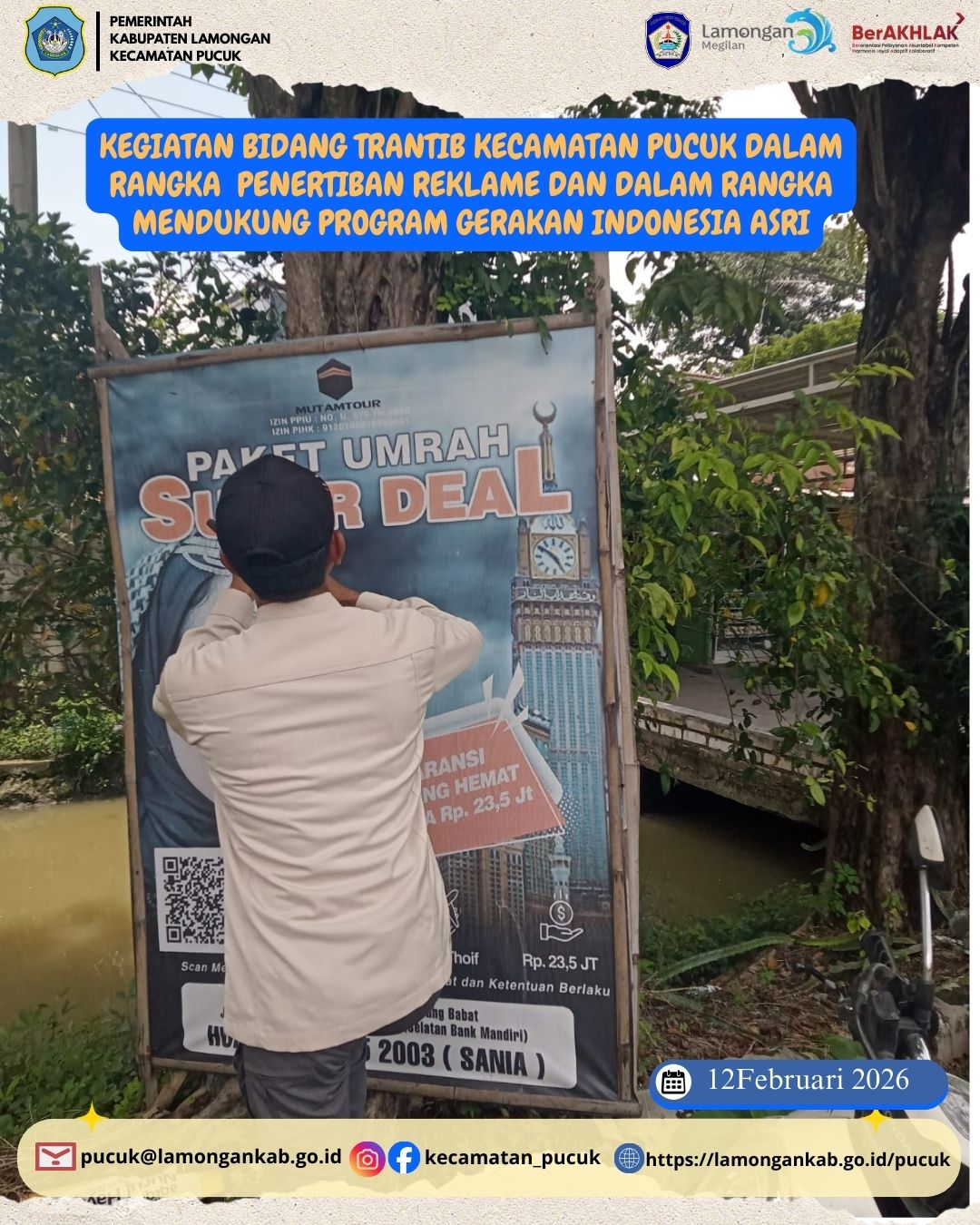 Dalam rangka menjaga ketertiban umum serta mendukung kebersihan dan keindahan lingkungan, Bidang Ketentraman dan Ketertiban (Trantib) Kecamatan Pucuk melaksanakan kegiatan penertiban reklame pada Kamis, 12 Februari 2026. Kegiatan ini merupakan bagian dari upaya berkelanjutan pemerintah kecamatan dalam menciptakan lingkungan yang tertib, aman, dan nyaman bagi seluruh masyarakat.