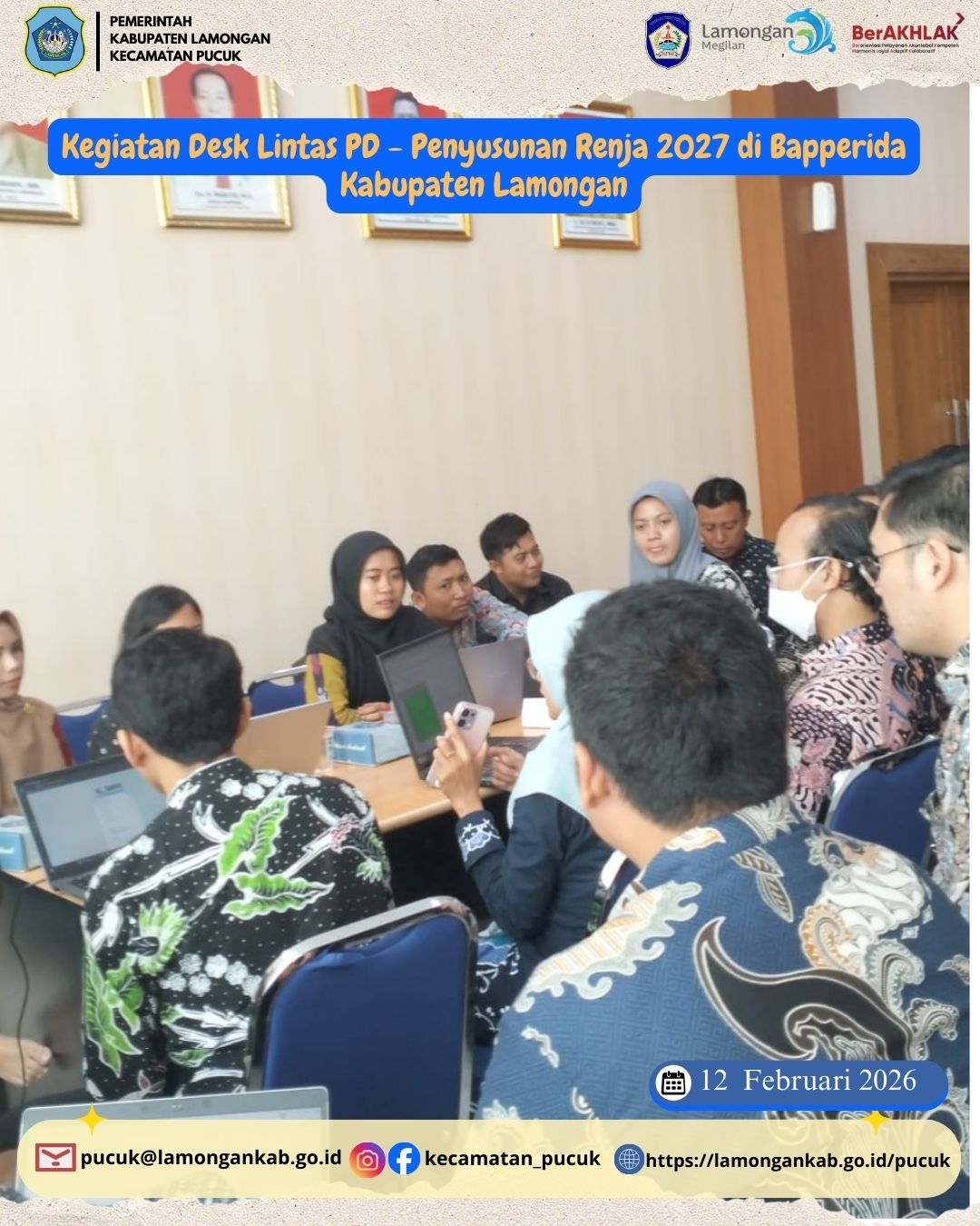 Kamis, 12 Februari 2026, Pemerintah Kecamatan Pucuk mengikuti kegiatan Desk Lintas Perangkat Daerah (PD) dalam rangka Penyusunan Rencana Kerja (Renja) Tahun 2027 yang diselenggarakan di Badan Perencanaan Pembangunan, Riset dan Inovasi Daerah (Bapperida) Kabupaten Lamongan.