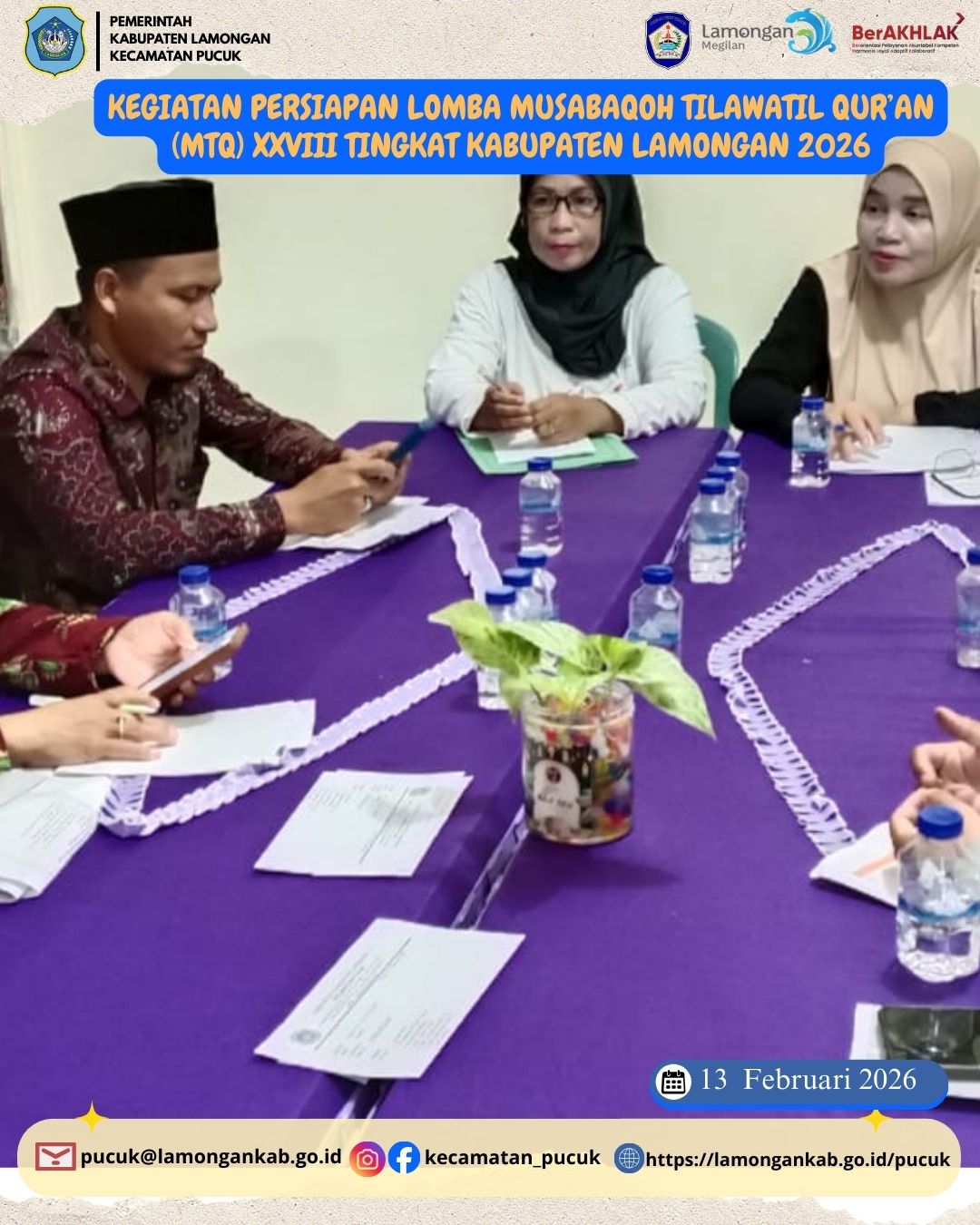 Kamis, 13 Februari 2026 – Pemerintah Kecamatan Pucuk melaksanakan Kegiatan Persiapan Lomba Musabaqoh Tilawatil Qur’an (MTQ) XXVIII Tingkat Kabupaten Lamongan sebagai bentuk komitmen dalam mendukung syiar Islam serta pembinaan generasi Qur’ani di wilayah Kecamatan Pucuk.
