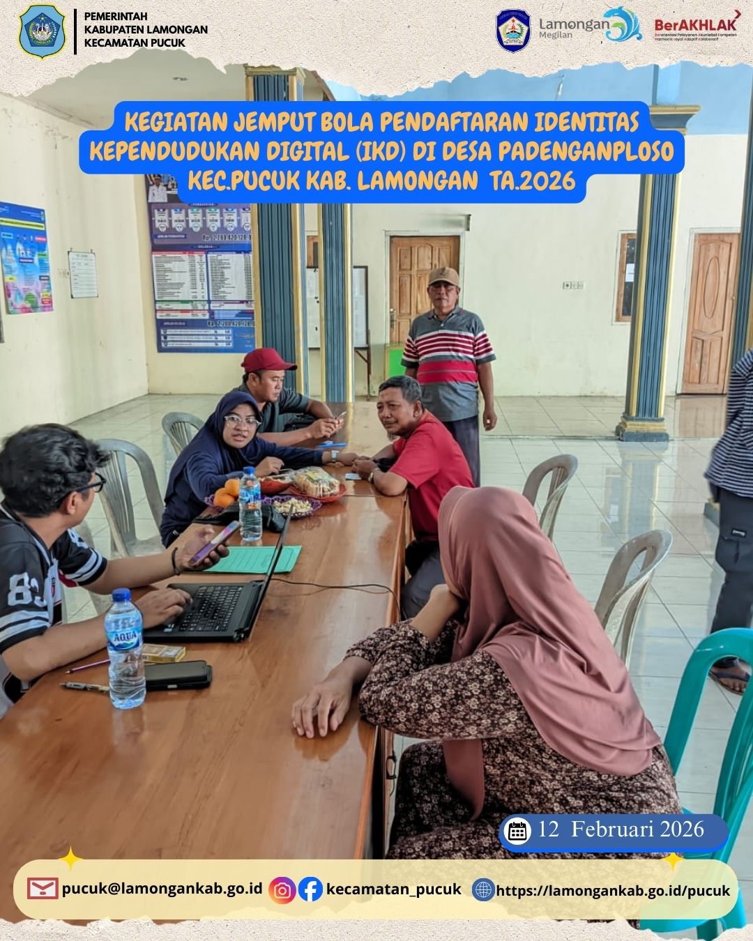 Dalam rangka mendukung percepatan transformasi layanan administrasi kependudukan berbasis digital, Pemerintah Kecamatan Pucuk bersama Pemerintah Desa Padenganploso melaksanakan kegiatan Jemput Bola Pendaftaran Identitas Kependudukan Digital (IKD) pada Jumat, 13 Februari 2026, bertempat di Desa Padenganploso, Kecamatan Pucuk, Kabupaten Lamongan.