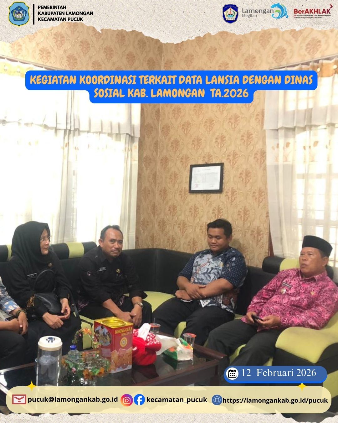 Pada hari Jumat, 13 Februari 2026, Kasi Pemberdayaan Masyarakat dan Desa (PPM) Kecamatan Pucuk menghadiri kegiatan koordinasi terkait pemutakhiran dan sinkronisasi data lanjut usia (lansia) bersama Dinas Sosial Kabupaten Lamongan Tahun 2026. Kegiatan ini dilaksanakan sebagai bagian dari upaya penguatan basis data kesejahteraan sosial yang akurat, terpadu, dan berkelanjutan di wilayah Kabupaten Lamongan.