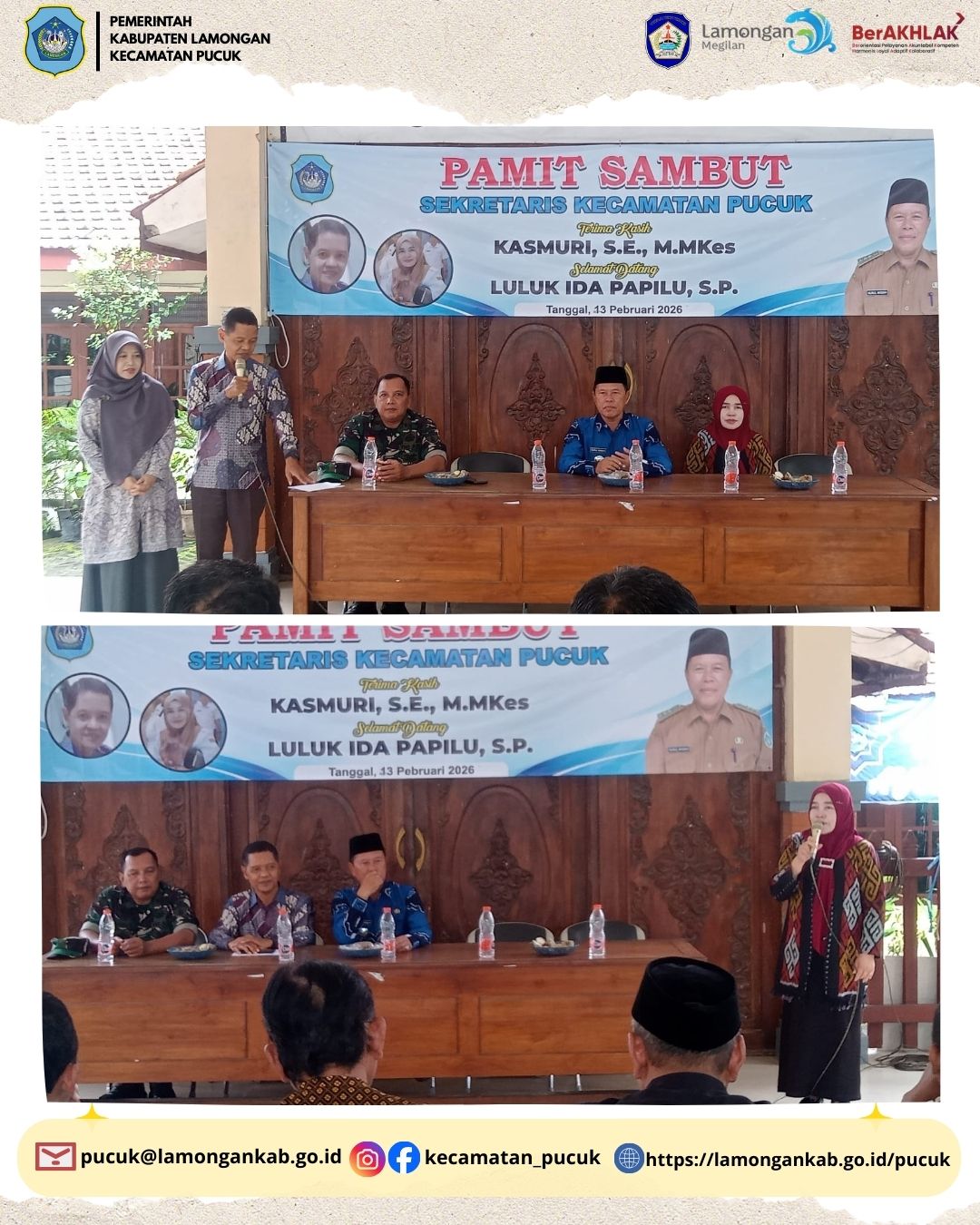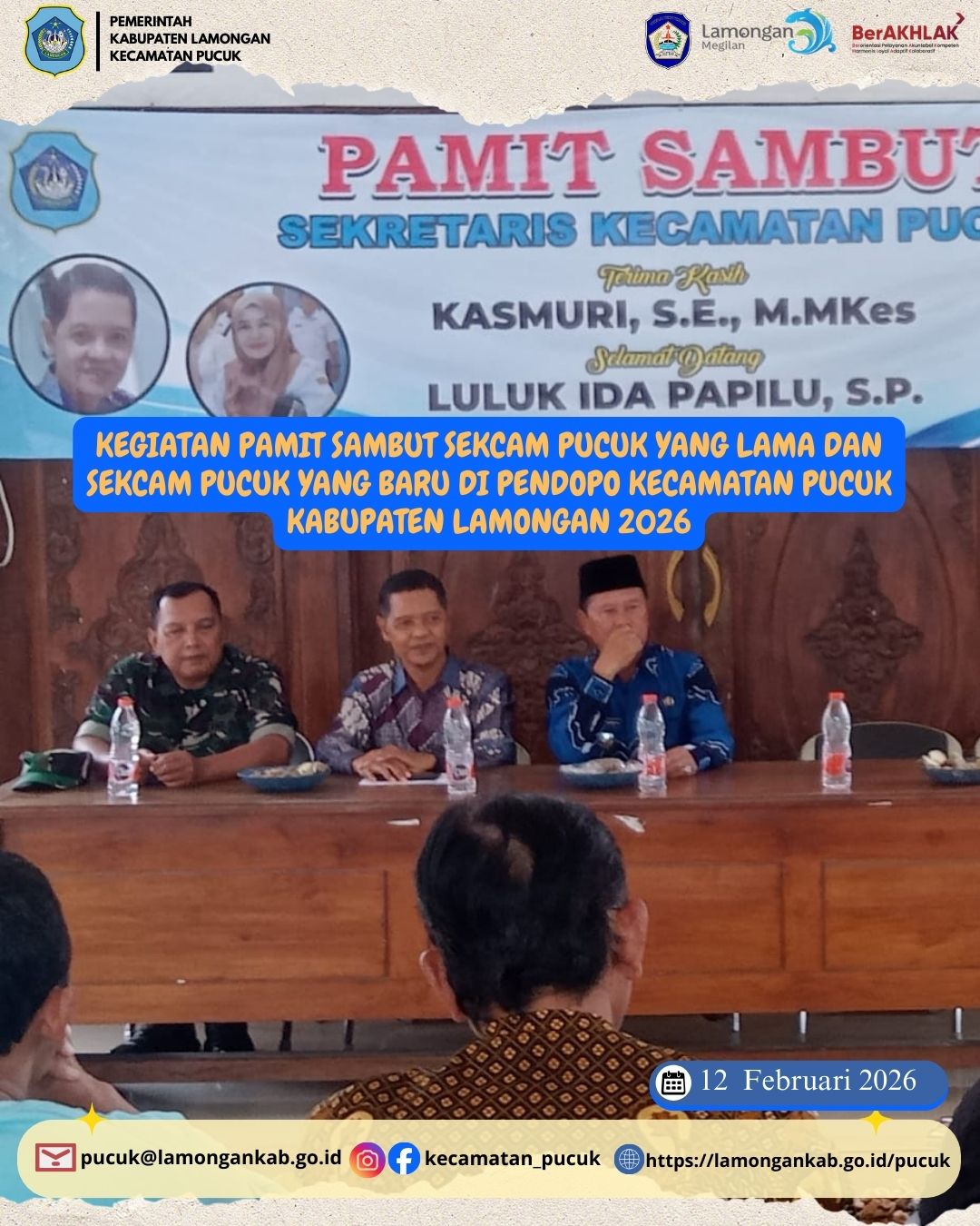 Pada hari Jumat, 13 Februari 2026, telah dilaksanakan kegiatan Pamit Sambut Sekretaris Kecamatan (Sekcam) Pucuk yang bertempat di Pendopo Kecamatan Pucuk, Kecamatan Pucuk, Kabupaten Lamongan.