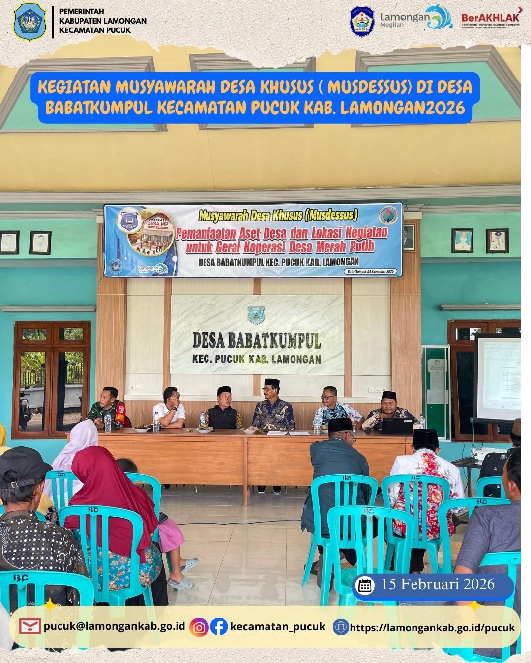 Pada tanggal 15 Februari 2026, Bapak Camat Pucuk bersama Kasi Pemberdayaan Masyarakat (PPM) Kecamatan Pucuk menghadiri kegiatan Musyawarah Desa Khusus (Musdessus) yang diselenggarakan di Desa Babatkumpul, Kecamatan Pucuk, Kabupaten Lamongan.
