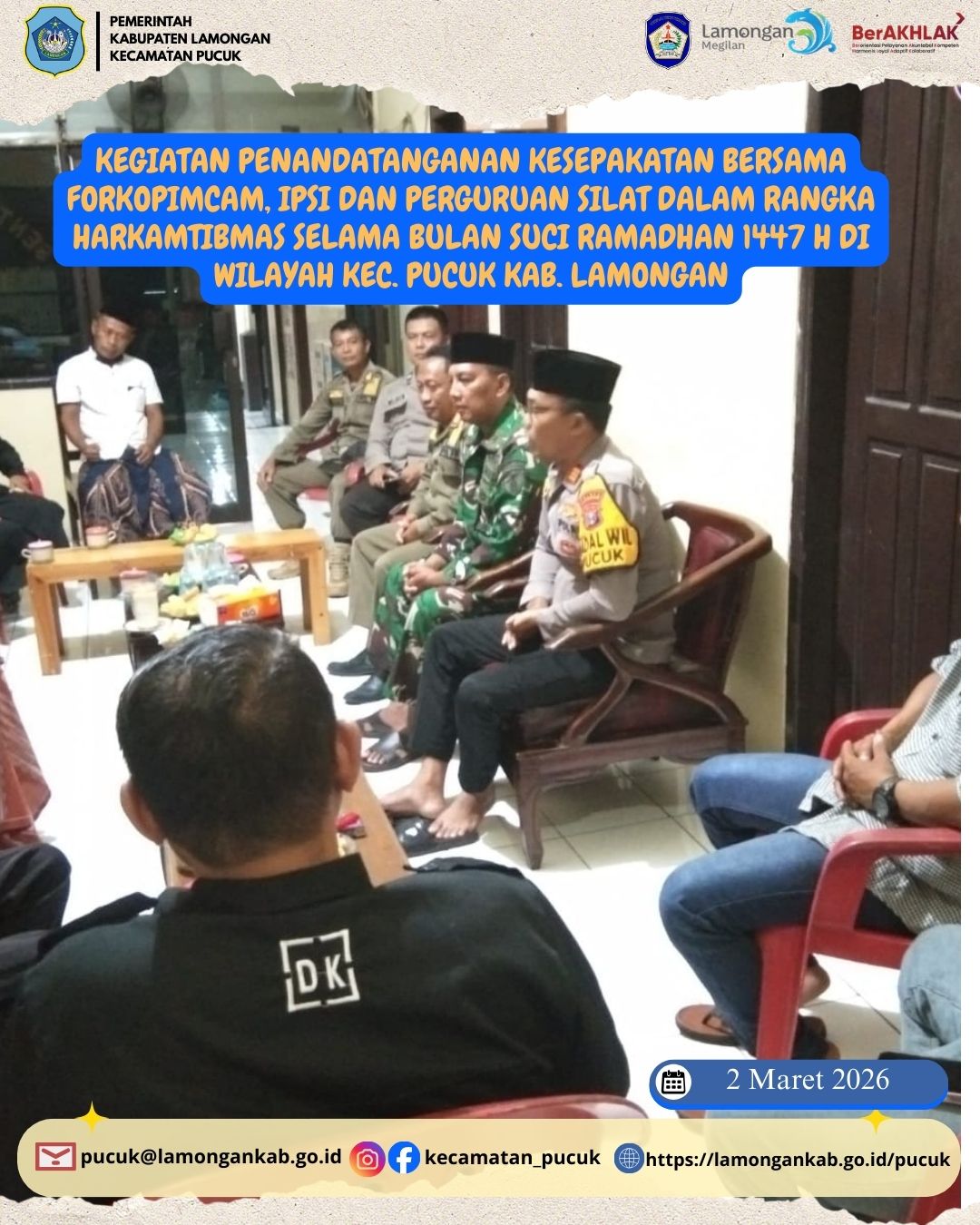 Pada hari Senin, 2 Maret 2026, bertempat di wilayah Kecamatan Pucuk Kabupaten Lamongan, telah dilaksanakan kegiatan Penandatanganan Kesepakatan Bersama antara Forum Koordinasi Pimpinan Kecamatan (FORKOPIMCAM) Pucuk dengan Ikatan Pencak Silat Indonesia (IPSI) serta seluruh Perguruan Silat yang ada di wilayah Kecamatan Pucuk. Kegiatan ini dilaksanakan sebagai bentuk komitmen bersama dalam menjaga dan menciptakan situasi keamanan dan ketertiban masyarakat (Harkamtibmas) yang kondusif selama Bulan Suci Ramadhan 1447 Hijriah.