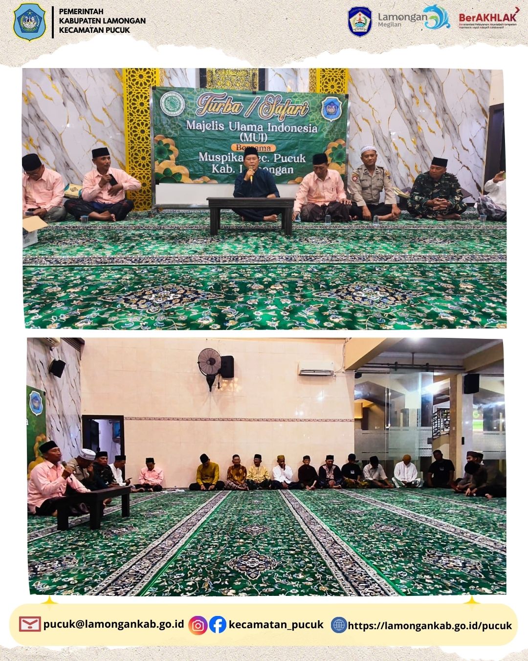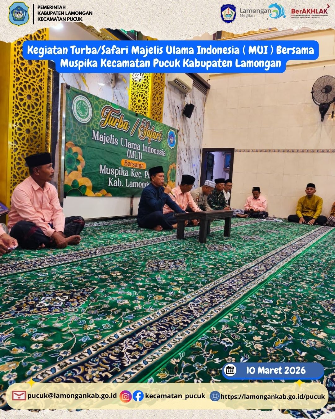 Pada hari Selasa, 10 Maret 2026, telah dilaksanakan kegiatan Turba/Safari Majelis Ulama Indonesia (MUI) bersama Muspika Kecamatan Pucuk yang berlangsung dengan penuh khidmat dan kebersamaan. Kegiatan ini merupakan bagian dari upaya mempererat sinergi antara ulama, umara, serta masyarakat dalam membangun kehidupan sosial dan keagamaan yang harmonis di wilayah Kecamatan Pucuk, Kabupaten Lamongan.
