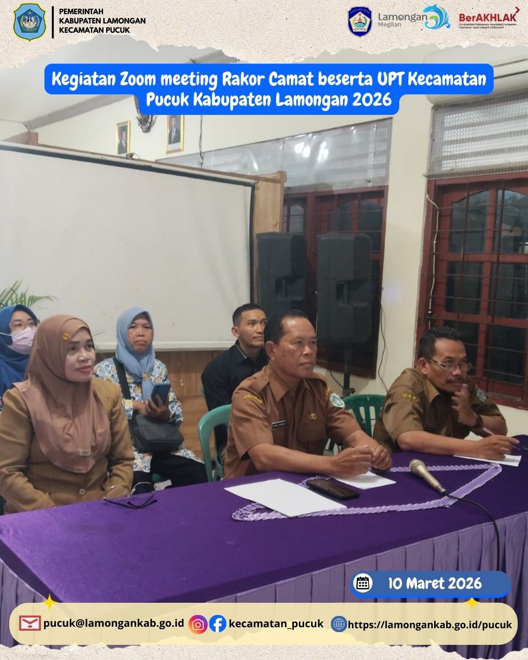 Pada hari Selasa, 10 Maret 2026, telah dilaksanakan kegiatan Zoom Meeting Rapat Koordinasi (Rakor) Camat bersama seluruh Unit Pelaksana Teknis (UPT) yang berada di wilayah Kecamatan Pucuk, Kabupaten Lamongan. Kegiatan ini merupakan bagian dari upaya penguatan koordinasi, sinkronisasi program kerja, serta peningkatan kualitas pelayanan kepada masyarakat di wilayah Kecamatan Pucuk.