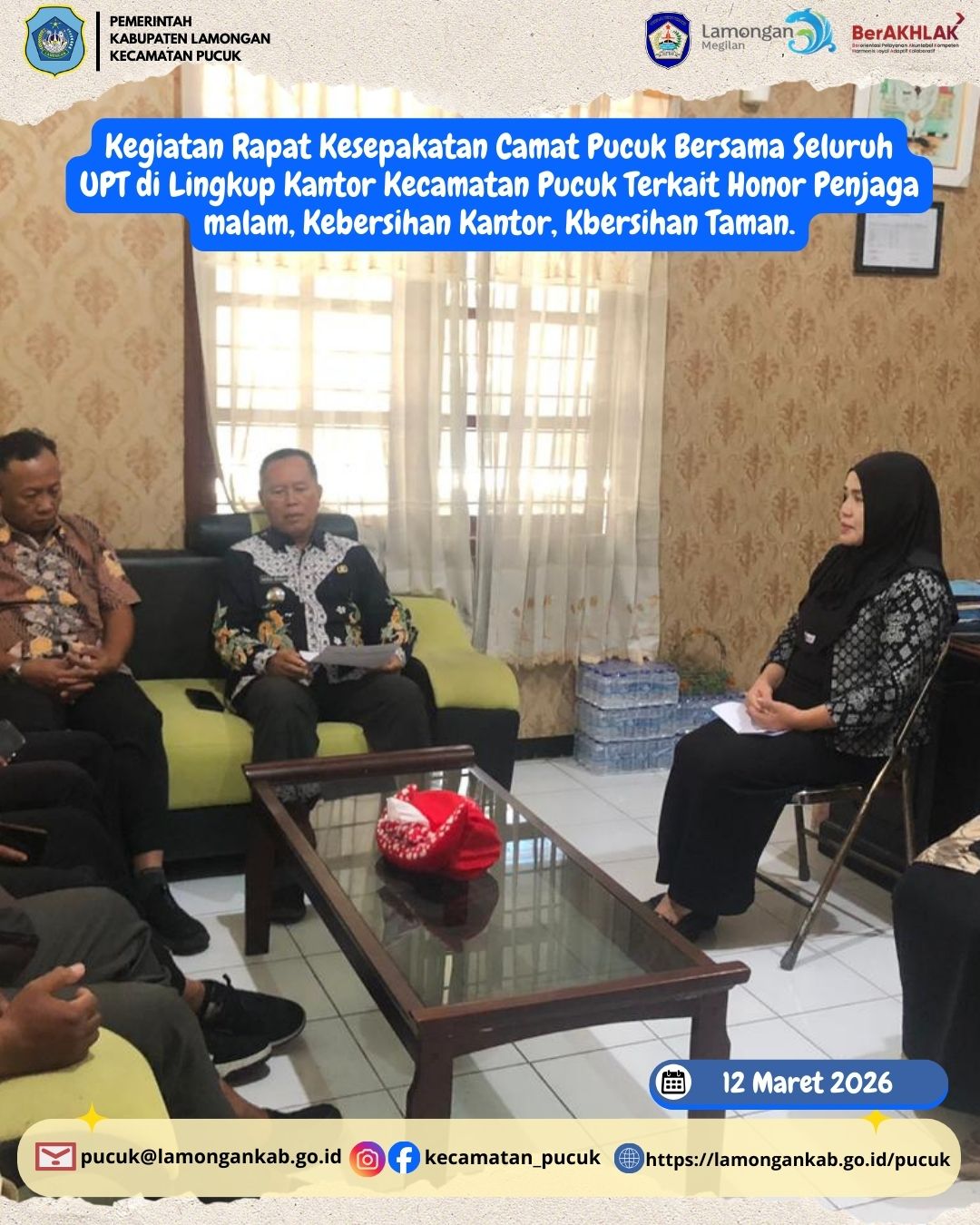 Pada hari Kamis, 12 Maret 2026, telah dilaksanakan Rapat Kesepakatan Camat Pucuk bersama seluruh UPT di lingkup Kantor Kecamatan Pucuk yang bertempat di Kantor Kecamatan Pucuk. Kegiatan ini dihadiri oleh Camat Pucuk, para Kepala UPT, serta perwakilan dari masing-masing unit kerja yang berada dalam koordinasi Kecamatan Pucuk.