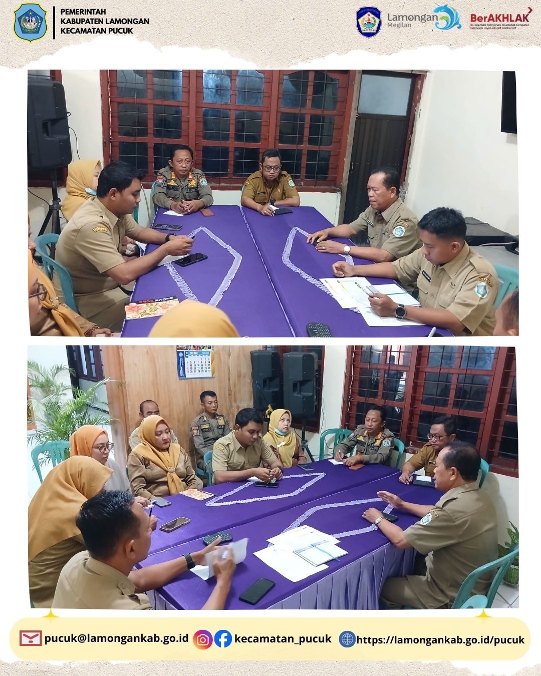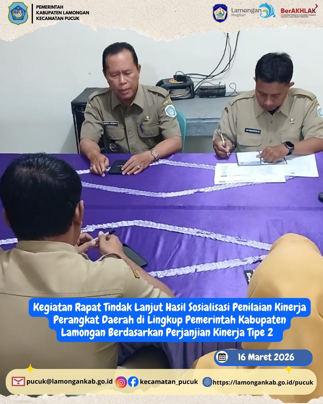 Pada hari Senin, 16 Maret 2026, Kantor Kecamatan Pucuk melaksanakan kegiatan Rapat Tindak Lanjut Hasil Sosialisasi Penilaian Kinerja Perangkat Daerah berdasarkan Perjanjian Kinerja Tipe 2. Kegiatan ini diikuti oleh seluruh jajaran pegawai Kecamatan Pucuk sebagai bentuk komitmen bersama dalam memahami serta mengimplementasikan kebijakan penilaian kinerja yang telah disosialisasikan sebelumnya.