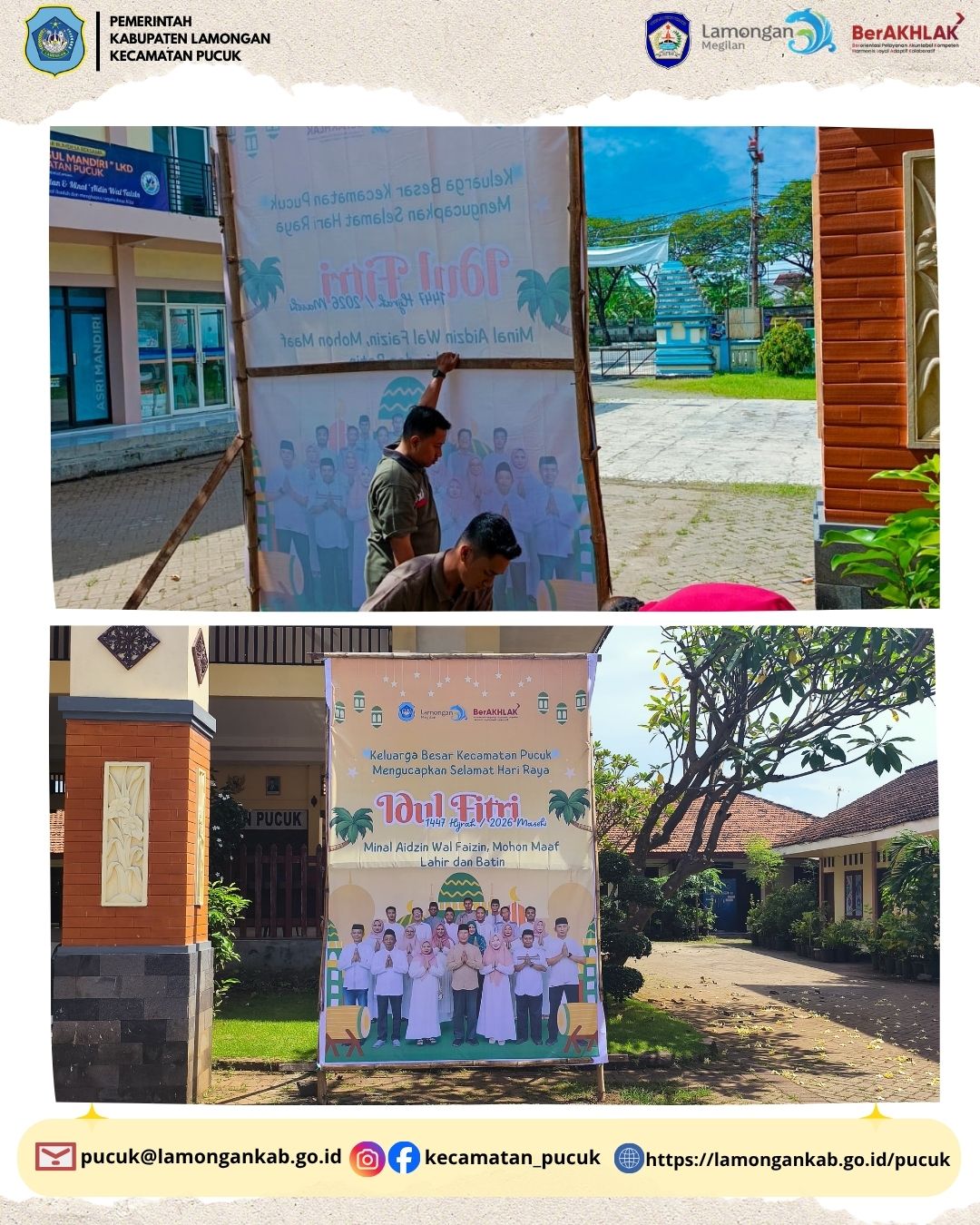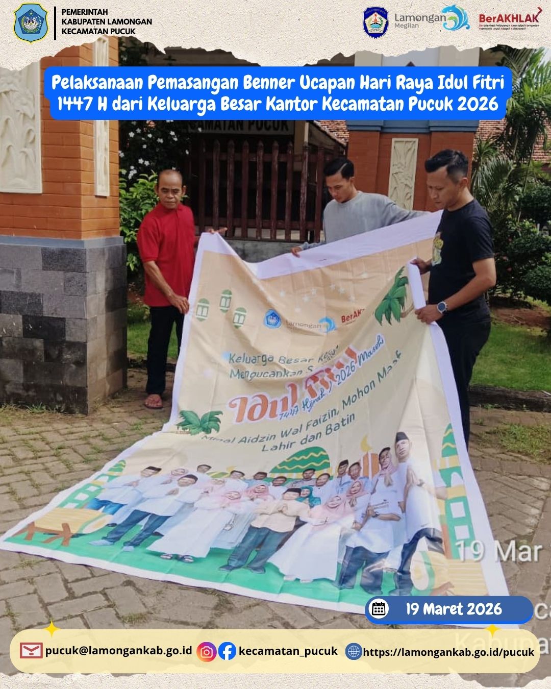 Pelaksanaan kegiatan pemasangan banner ucapan Hari Raya Idul Fitri 1447 Hijriyah telah dilaksanakan pada tanggal 19 Maret 2026 oleh jajaran Keluarga Besar Kantor Kecamatan Pucuk. Kegiatan ini merupakan bentuk partisipasi aktif sekaligus wujud kebersamaan dalam menyambut datangnya hari kemenangan bagi umat Islam setelah menjalankan ibadah puasa di bulan suci Ramadan.