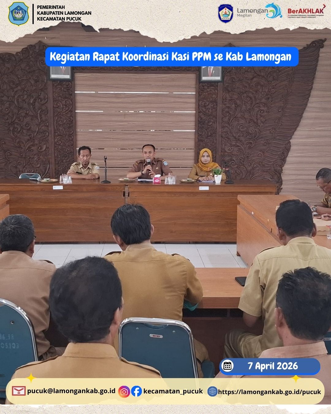 Rapat koordinasi ini dihadiri oleh seluruh Kasi PPM dari berbagai kecamatan di Kabupaten Lamongan, termasuk perwakilan dari Kecamatan Pucuk. Dalam kegiatan ini dibahas berbagai isu penting terkait pelaksanaan program pemberdayaan masyarakat, evaluasi kegiatan yang telah berjalan, serta strategi peningkatan kualitas pelayanan dan pembangunan berbasis masyarakat.