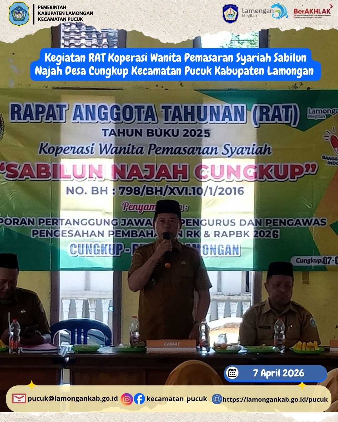 Kegiatan Rapat Anggota Tahunan (RAT) Koperasi Wanita Pemasaran Syariah Sabilun Najah Desa Cungkup Kecamatan Pucuk Kabupaten Lamongan telah sukses dilaksanakan pada tanggal 7 April 2026. Kegiatan ini merupakan agenda rutin tahunan yang memiliki peran penting dalam menjaga transparansi, akuntabilitas, serta keberlanjutan pengelolaan koperasi berbasis prinsip syariah.