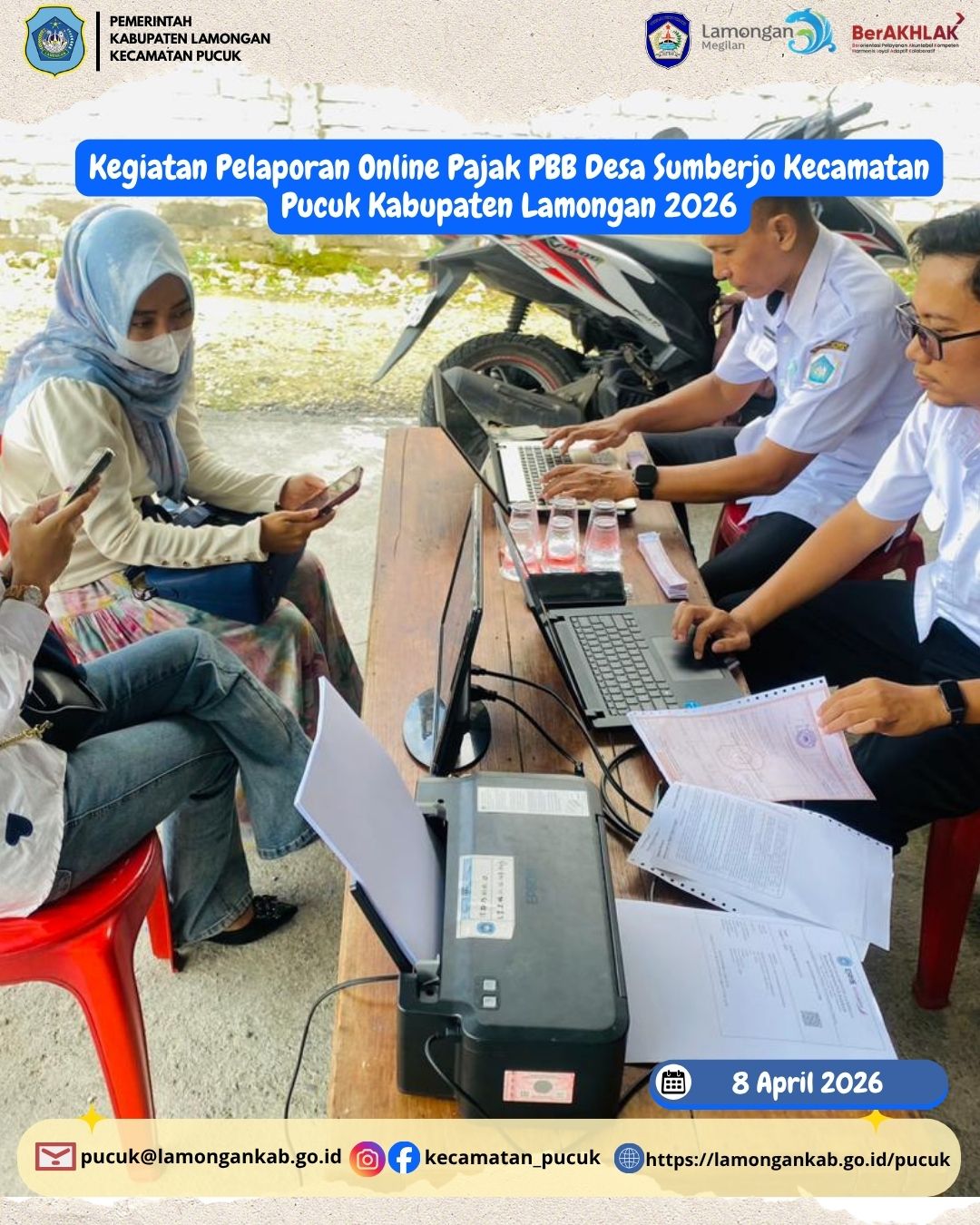 Pada tanggal 8 April 2026, telah dilaksanakan kegiatan Pelaporan Online Pajak Bumi dan Bangunan (PBB) Tahun 2026 oleh Pemerintah Desa Sumberjo, Kecamatan Pucuk, Kabupaten Lamongan. Kegiatan ini merupakan bagian dari upaya peningkatan tertib administrasi perpajakan serta optimalisasi penerimaan daerah melalui pemanfaatan sistem digital.