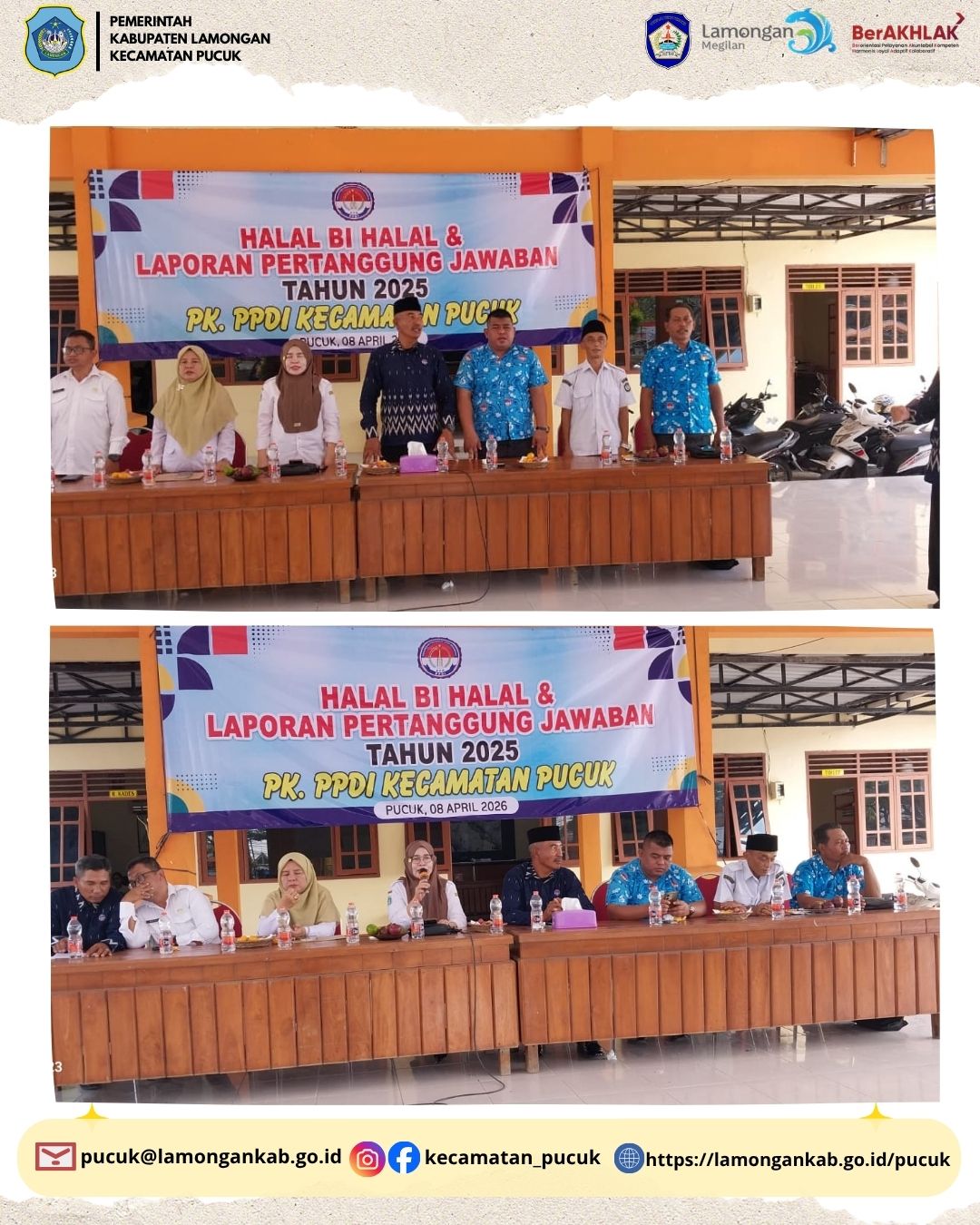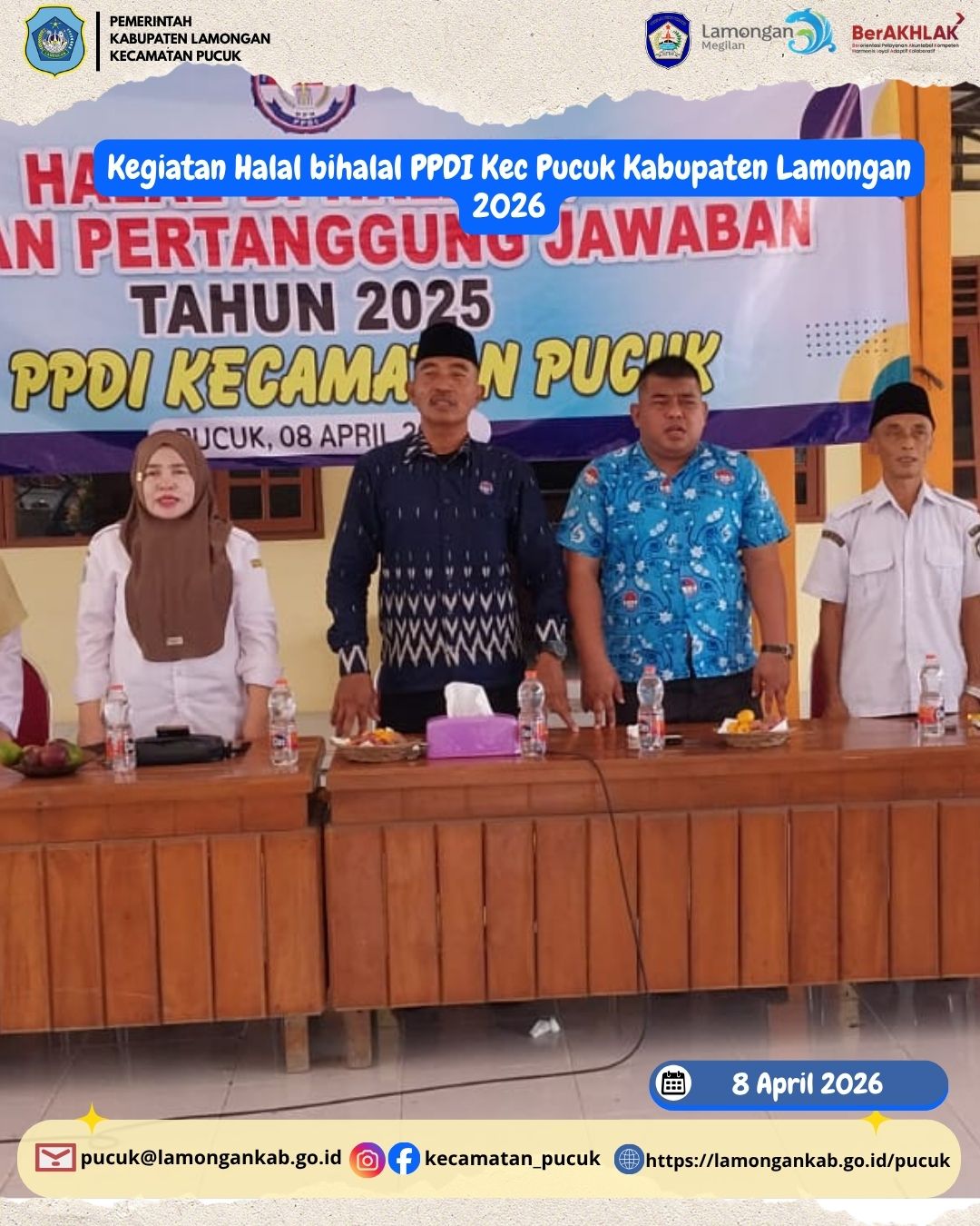 Pada tanggal 8 April 2026, telah dilaksanakan kegiatan Halal Bihalal Persatuan Perangkat Desa Indonesia (PPDI) Kecamatan Pucuk, Kabupaten Lamongan Tahun 2026, yang berlangsung dengan penuh kehangatan, kebersamaan, dan semangat silaturahmi. Kegiatan ini menjadi salah satu momentum penting dalam mempererat hubungan antar perangkat desa serta memperkuat koordinasi dalam menjalankan tugas pemerintahan di tingkat desa.