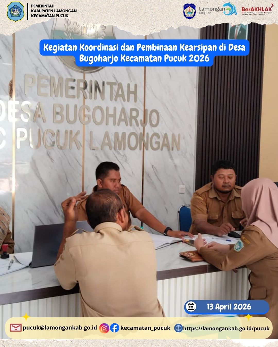 Kegiatan Koordinasi dan Pembinaan Kearsipan Desa Bugoharjo, Kecamatan Pucuk telah dilaksanakan pada tanggal 13 April 2026 sebagai upaya meningkatkan tertib administrasi dan kualitas pengelolaan arsip di tingkat desa.