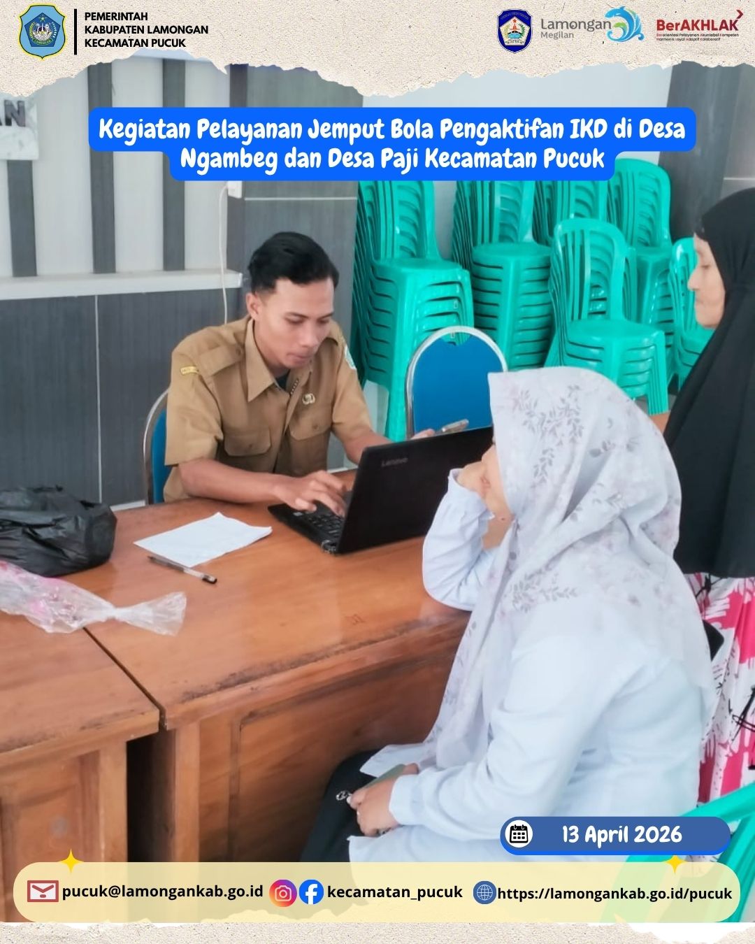 Dalam rangka meningkatkan kualitas pelayanan administrasi kependudukan kepada masyarakat, telah dilaksanakan kegiatan Pelayanan Jemput Bola Pengaktifan Identitas Kependudukan Digital (IKD) pada tanggal 13 April 2026 di Desa Ngambeg dan Desa Paji, Kecamatan Pucuk.