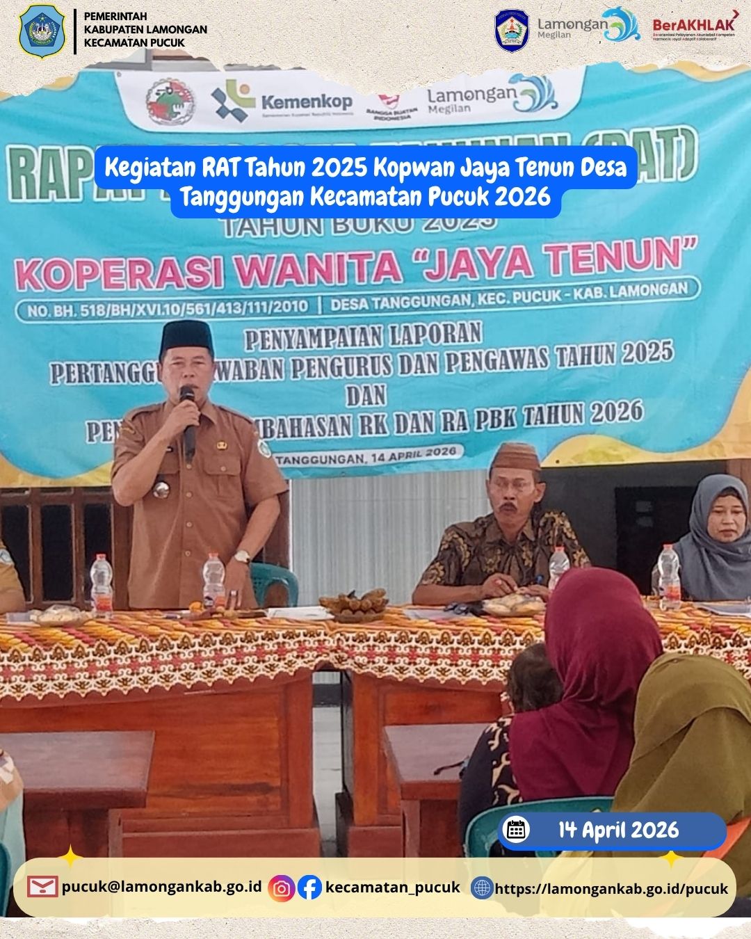 Pada hari Selasa, 14 April 2026, telah dilaksanakan kegiatan Rapat Anggota Tahunan (RAT) Tahun Buku 2025 Koperasi Wanita (Kopwan) Jaya Tenun yang bertempat di Desa Tanggungan, Kecamatan Pucuk. Kegiatan ini merupakan agenda rutin tahunan yang memiliki peran penting dalam mengevaluasi kinerja koperasi selama satu tahun terakhir serta merumuskan rencana kerja ke depan.