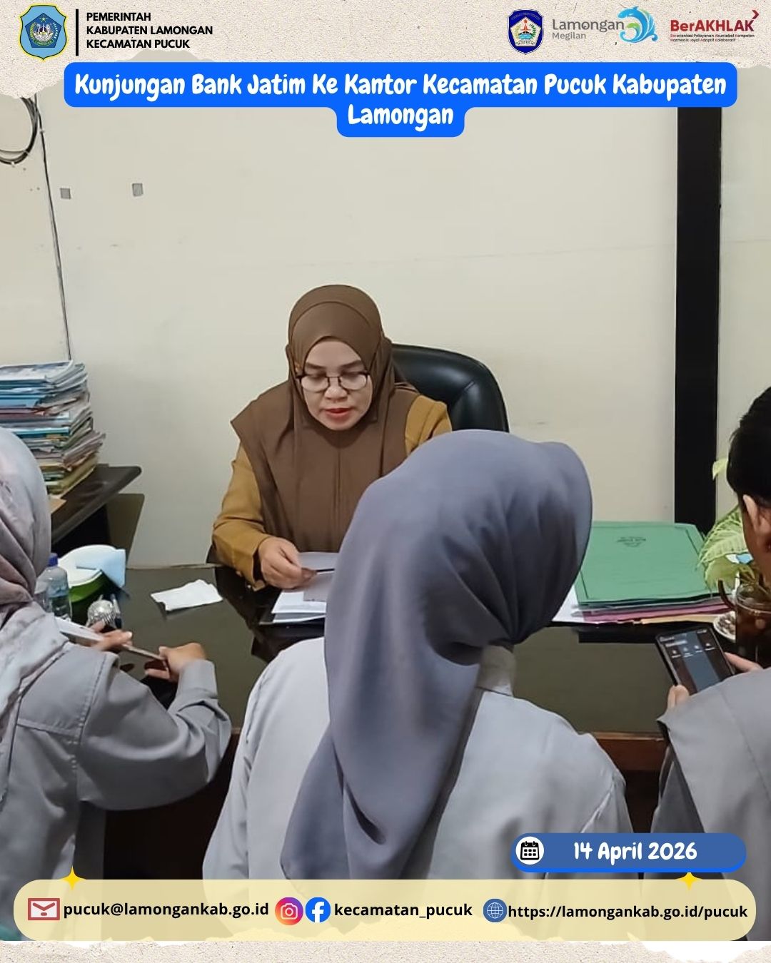 Pada hari Selasa, 14 April 2026, Kantor Kecamatan Pucuk, Kabupaten Lamongan menerima kunjungan dari Bank Jatim dalam rangka mempererat sinergi dan kerja sama antara sektor perbankan dengan pemerintah kecamatan. Kegiatan ini menjadi momentum penting dalam mendukung peningkatan pelayanan publik serta penguatan sektor ekonomi masyarakat di wilayah Kecamatan Pucuk.