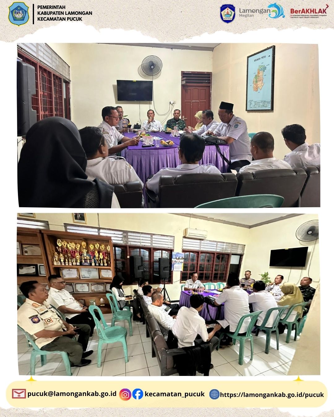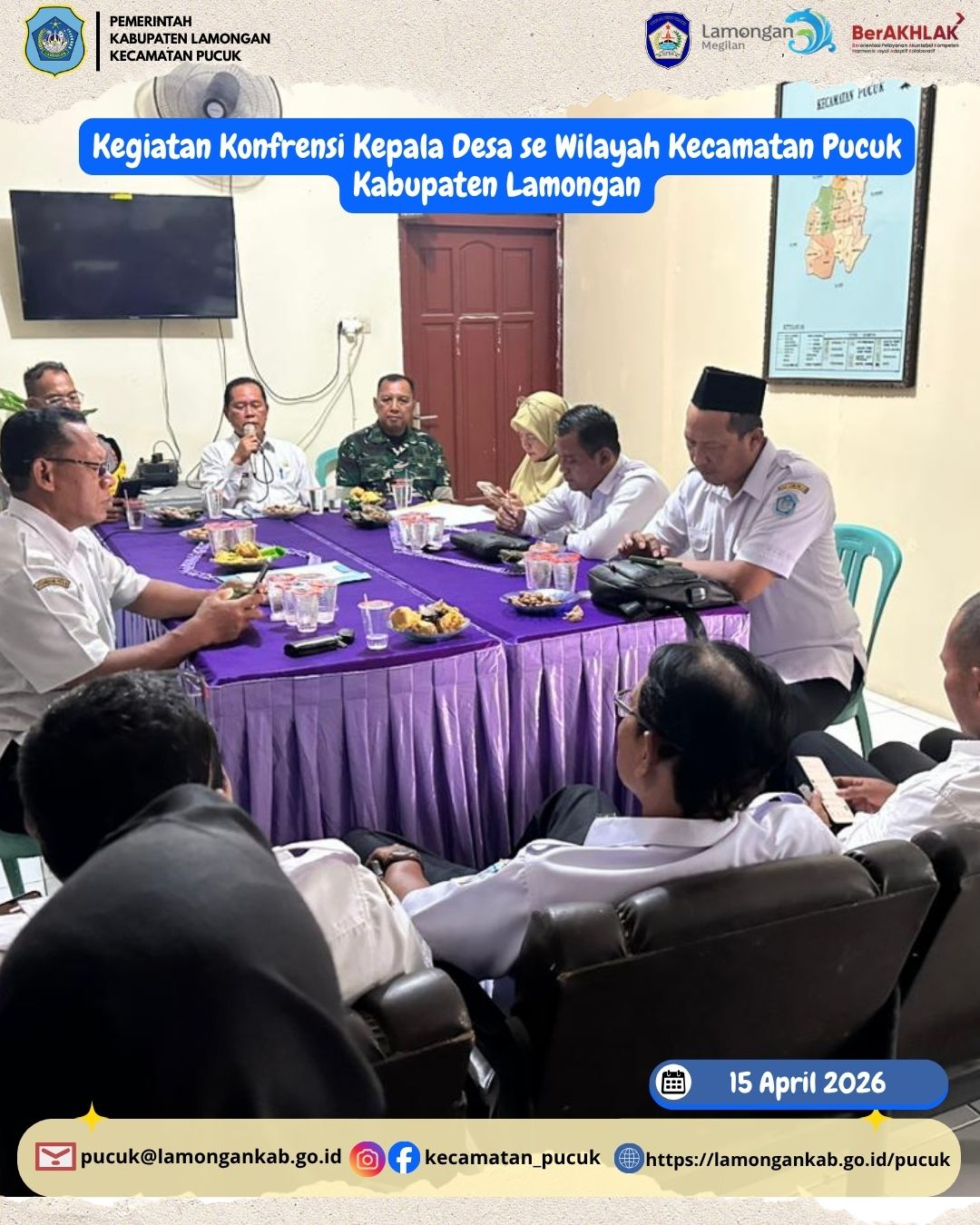 Pada hari Rabu, 15 April 2026, telah dilaksanakan kegiatan Konferensi Kepala Desa se-Wilayah Kecamatan Pucuk, Kabupaten Lamongan. Kegiatan ini merupakan forum koordinasi dan komunikasi yang penting dalam rangka menyatukan langkah serta memperkuat sinergi antara pemerintah kecamatan dan seluruh pemerintah desa di wilayah Kecamatan Pucuk.