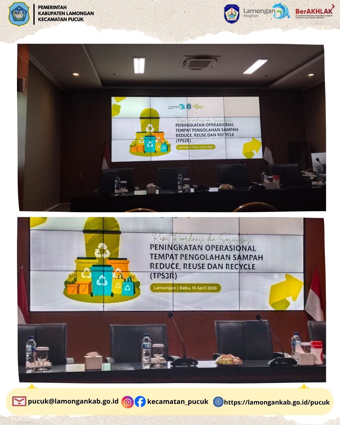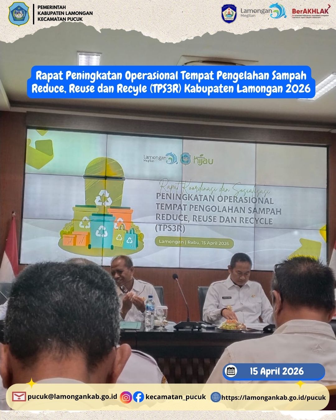 Pada hari Rabu, 15 April 2026, telah dilaksanakan Rapat Peningkatan Operasional Tempat Pengolahan Sampah Reduce, Reuse, dan Recycle (TPS3R) di wilayah Kabupaten Lamongan. Kegiatan ini menjadi salah satu langkah strategis dalam upaya meningkatkan efektivitas pengelolaan sampah berbasis masyarakat sekaligus mendukung terciptanya lingkungan yang bersih, sehat, dan berkelanjutan, khususnya di Kecamatan Pucuk.