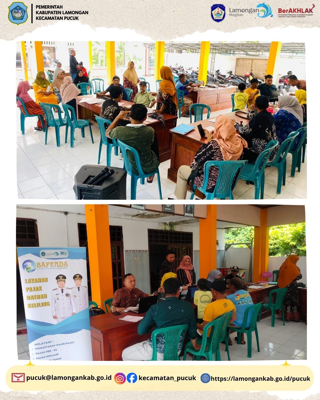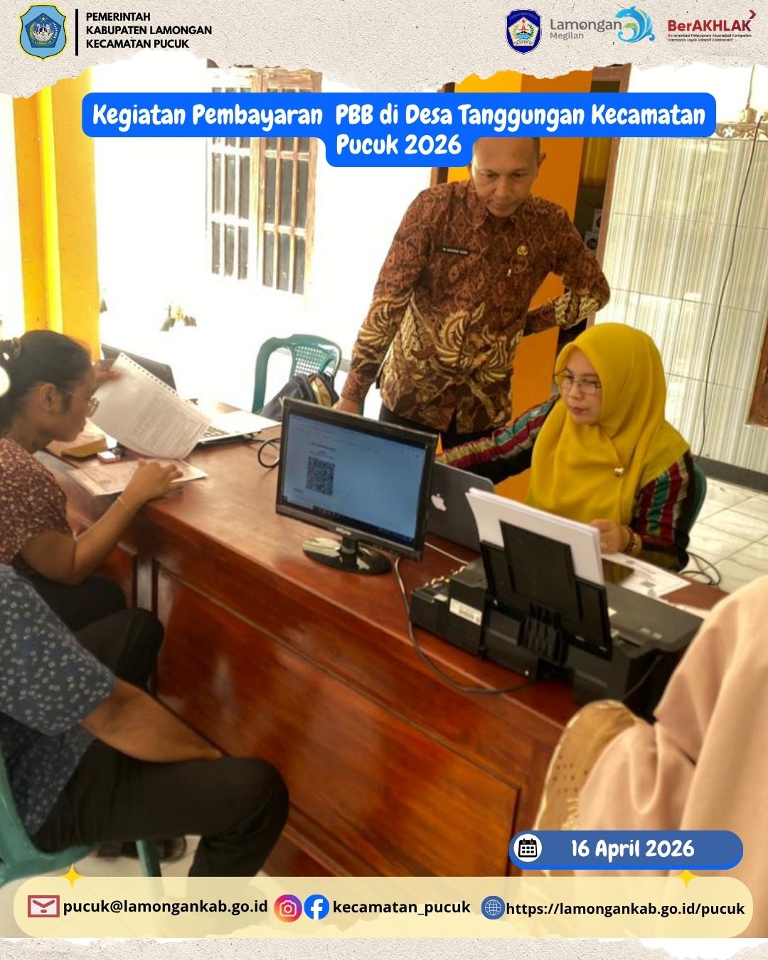 Pada hari Kamis, 16 April 2026, telah dilaksanakan kegiatan pembayaran Pajak Bumi dan Bangunan (PBB) di Desa Tanggungan, Kecamatan Pucuk, Kabupaten Lamongan. Kegiatan ini merupakan bagian dari upaya pemerintah dalam mendorong kesadaran dan kepatuhan masyarakat terhadap kewajiban perpajakan, khususnya dalam sektor Pajak Bumi dan Bangunan yang memiliki peran penting dalam mendukung pembangunan daerah.