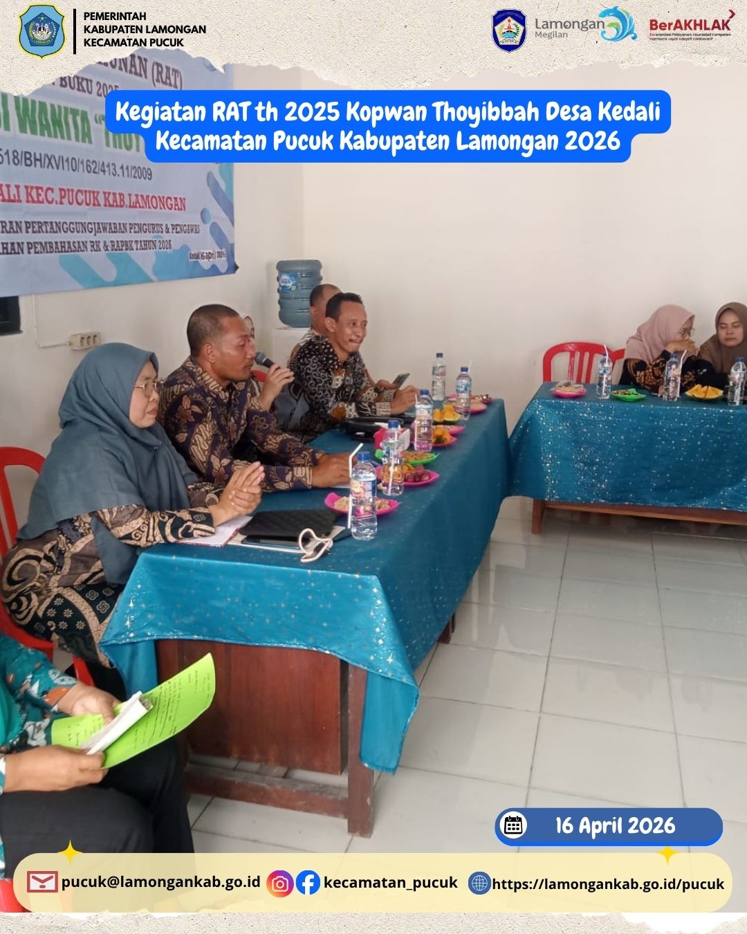 Pada hari Kamis, 16 April 2026, telah dilaksanakan kegiatan Rapat Anggota Tahunan (RAT) Tahun Buku 2025 Koperasi Wanita (Kopwan) Thoyibbah Desa Kedali, Kecamatan Pucuk, Kabupaten Lamongan. Kegiatan ini merupakan agenda penting tahunan sebagai bentuk pertanggungjawaban pengurus kepada seluruh anggota atas pelaksanaan kegiatan dan pengelolaan koperasi selama satu tahun terakhir.