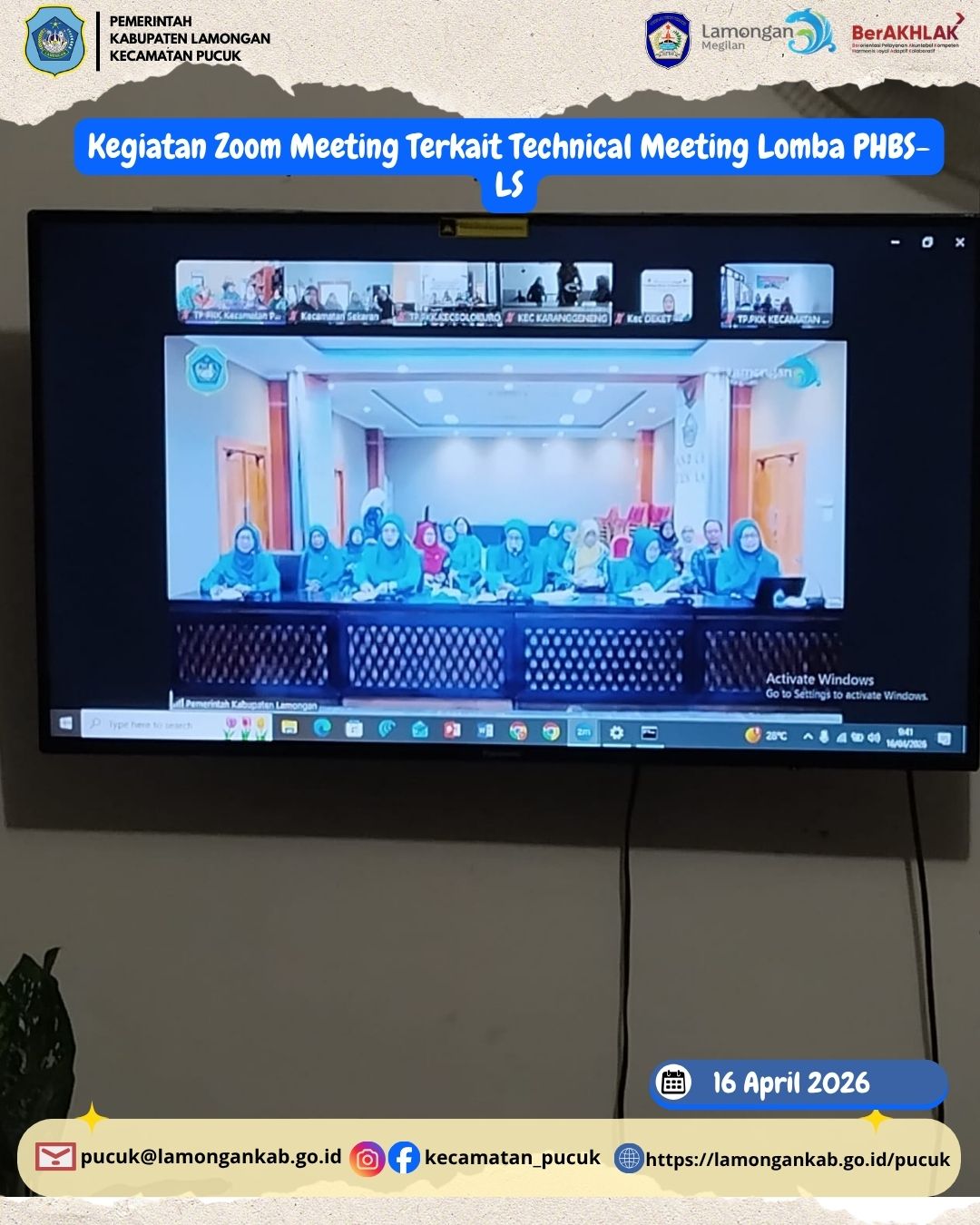 Pada hari Kamis, 16 April 2026, telah dilaksanakan kegiatan Zoom Meeting terkait Technical Meeting Lomba Perilaku Hidup Bersih dan Sehat (PHBS) dan Lingkungan Sehat (LS) yang bertempat di Kantor Kecamatan Pucuk, Kabupaten Lamongan. Kegiatan ini diikuti oleh perwakilan dari Kecamatan Pucuk bersama perangkat desa serta pihak-pihak terkait sebagai bentuk persiapan dalam menghadapi pelaksanaan lomba di tingkat kabupaten.