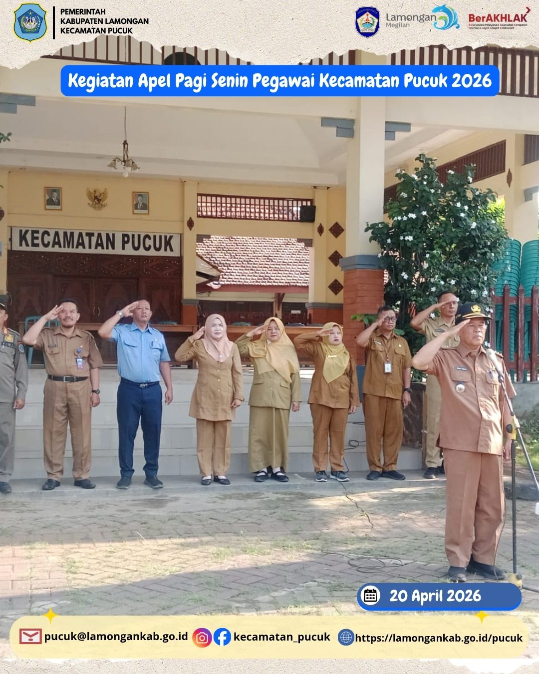 Kecamatan Pucuk kembali melaksanakan kegiatan rutin Apel Pagi Senin yang diikuti oleh seluruh pegawai di lingkungan Kantor Kecamatan Pucuk pada hari Senin, 20 April 2026. Kegiatan ini berlangsung dengan tertib dan penuh khidmat sebagai bentuk komitmen bersama dalam meningkatkan kedisiplinan, tanggung jawab, serta kualitas pelayanan kepada masyarakat.