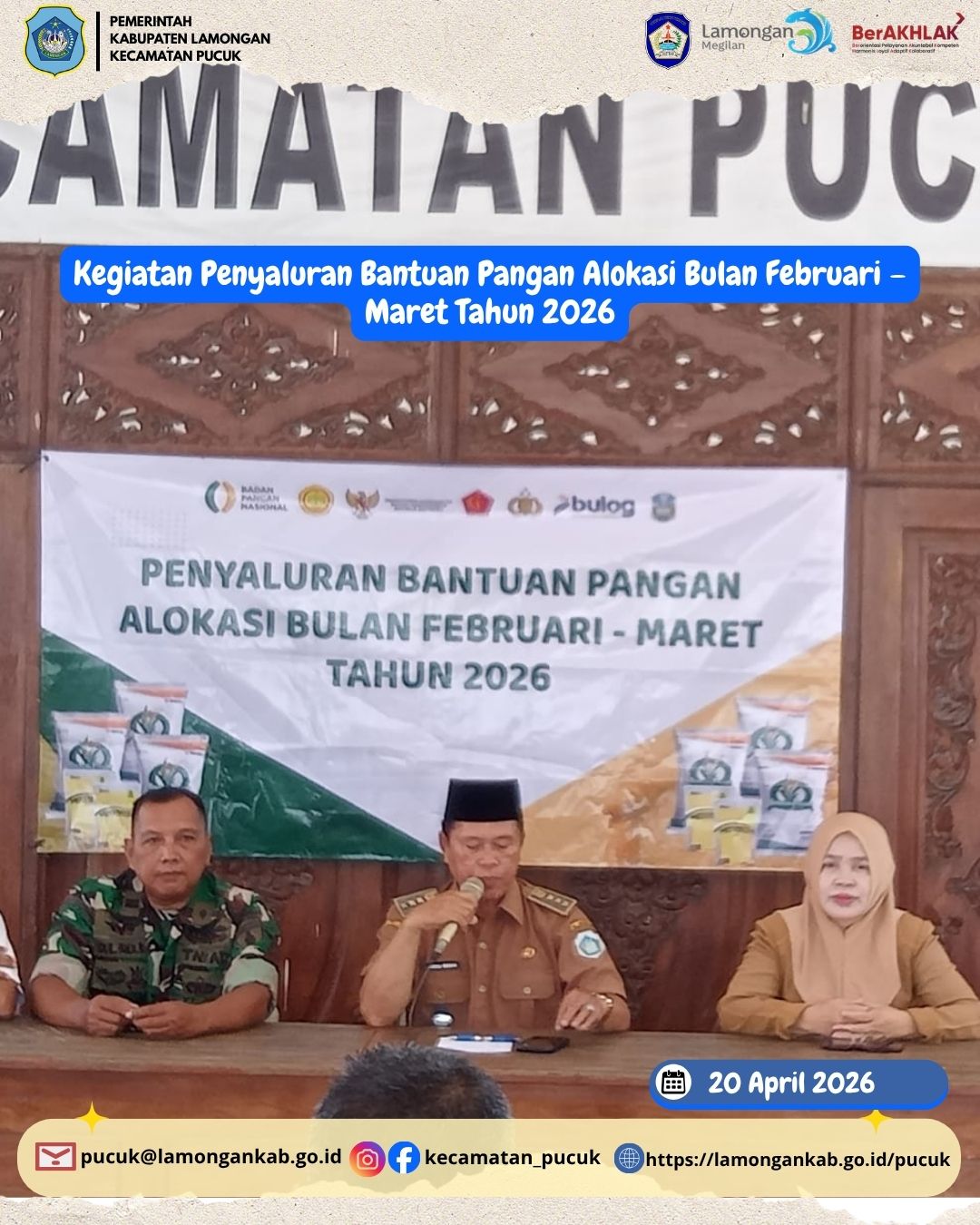 Pemerintah Kecamatan Pucuk melaksanakan kegiatan penyaluran bantuan pangan kepada masyarakat sebagai bagian dari program pemenuhan kebutuhan dasar bagi warga yang membutuhkan. Kegiatan ini dilaksanakan pada tanggal 20 April 2026 dengan menyalurkan bantuan pangan untuk alokasi bulan Februari hingga Maret Tahun 2026.
