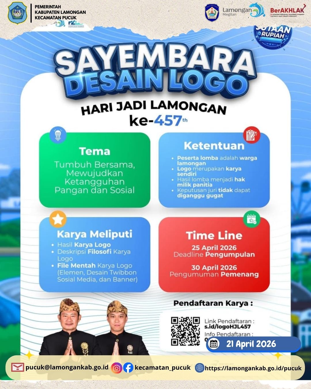 Pemerintah Kecamatan Pucuk mengumumkan dibukanya Sayembara Desain Logo untuk Hari Jadi Lamongan ke-457 yang akan diselenggarakan pada tanggal 21 April 2026. Sayembara ini bertujuan untuk mengajak seluruh masyarakat, khususnya para desainer grafis dan pelajar di wilayah Kecamatan Pucuk dan sekitarnya, untuk berpartisipasi dalam menciptakan logo yang dapat mewakili semangat dan identitas Kota Lamongan pada perayaan ulang tahun yang ke-457.