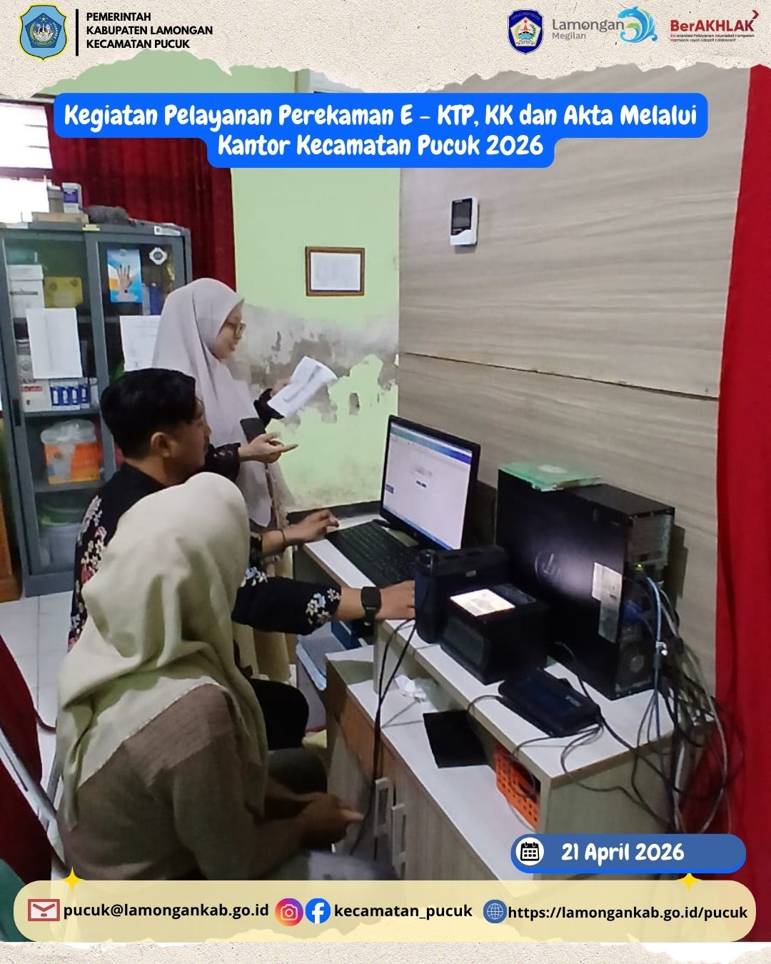 Pada tanggal 21 April 2026, Pemerintah Kecamatan Pucuk kembali menyelenggarakan Pelayanan Perekaman E-KTP, Kartu Keluarga (KK), dan Akta untuk masyarakat Kecamatan Pucuk. Kegiatan ini bertujuan untuk memberikan kemudahan bagi warga dalam pengurusan administrasi kependudukan, serta mempercepat proses perekaman data dalam rangka meningkatkan kualitas pelayanan publik di bidang administrasi kependudukan.