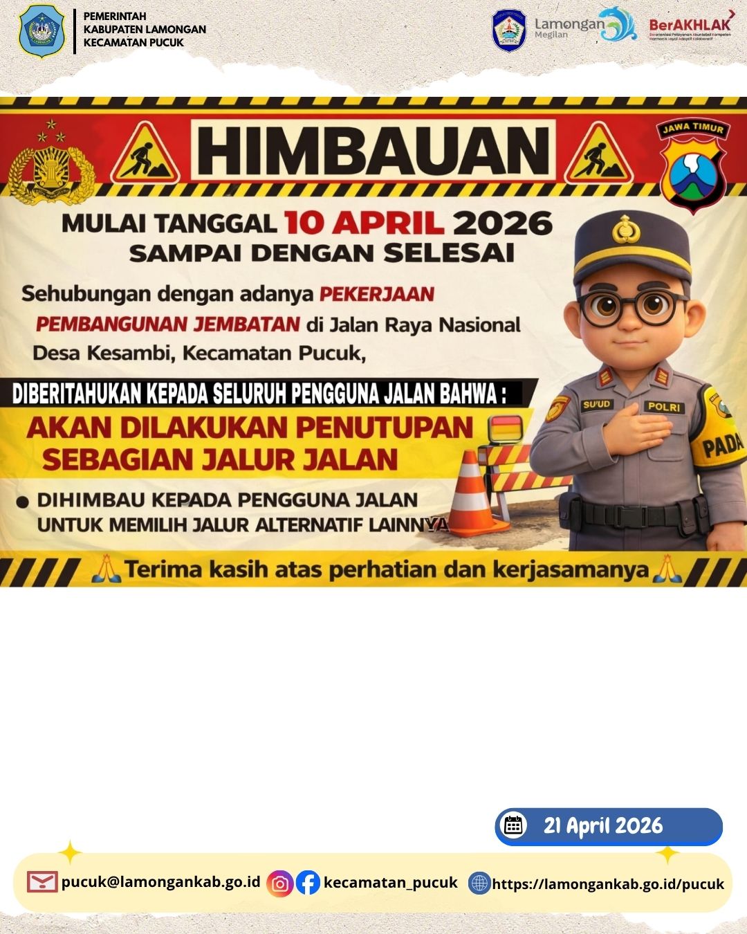 Pemerintah Kecamatan Pucuk, bersama dengan Dinas Pekerjaan Umum dan Penataan Ruang (PUPR) Kabupaten Lamongan, mengumumkan bahwa mulai hari ini, 21 April 2026, akan dimulai pekerjaan Pembangunan Jembatan Jalan Raya Nasional di Desa Kesambi, Kecamatan Pucuk. Pembangunan jembatan ini merupakan bagian dari proyek infrastruktur penting yang bertujuan untuk meningkatkan konektivitas dan mendukung kelancaran transportasi di wilayah Kecamatan Pucuk, serta memberikan dampak positif terhadap perekonomian dan kesejahteraan masyarakat setempat.