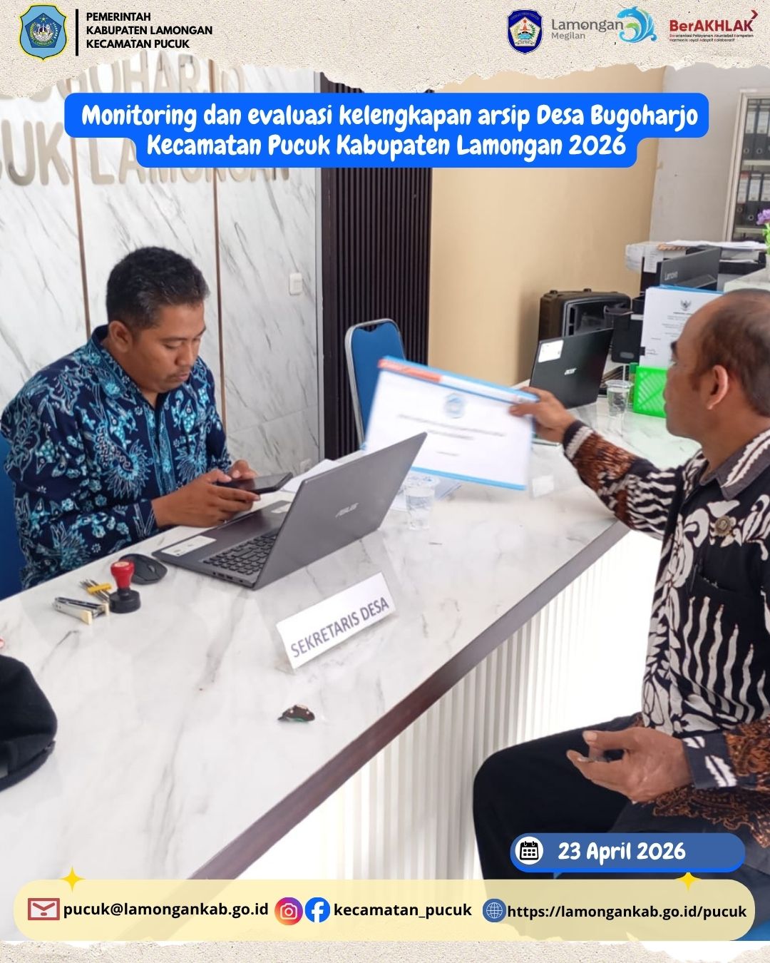 Pada tanggal 23 April 2026, Kecamatan Pucuk melaksanakan kegiatan monitoring dan evaluasi (monev) kelengkapan arsip di Desa Bugoharjo, Kabupaten Lamongan. Kegiatan ini merupakan bagian dari upaya pembinaan dan pengawasan administrasi pemerintahan desa agar tertib, sistematis, dan sesuai dengan ketentuan peraturan perundang-undangan yang berlaku.