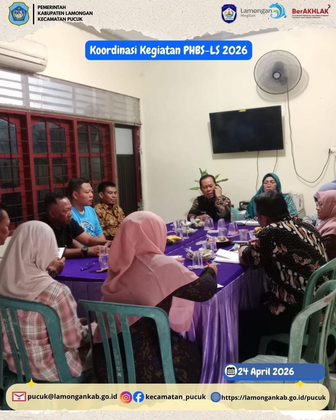 Dalam rangka meningkatkan kualitas kesehatan masyarakat dan mendorong pola hidup yang lebih baik, Pemerintah Kecamatan Pucuk melaksanakan kegiatan koordinasi Program Perilaku Hidup Bersih dan Sehat Lintas Sektor (PHBS-LS) pada Jumat, 24 April 2026.